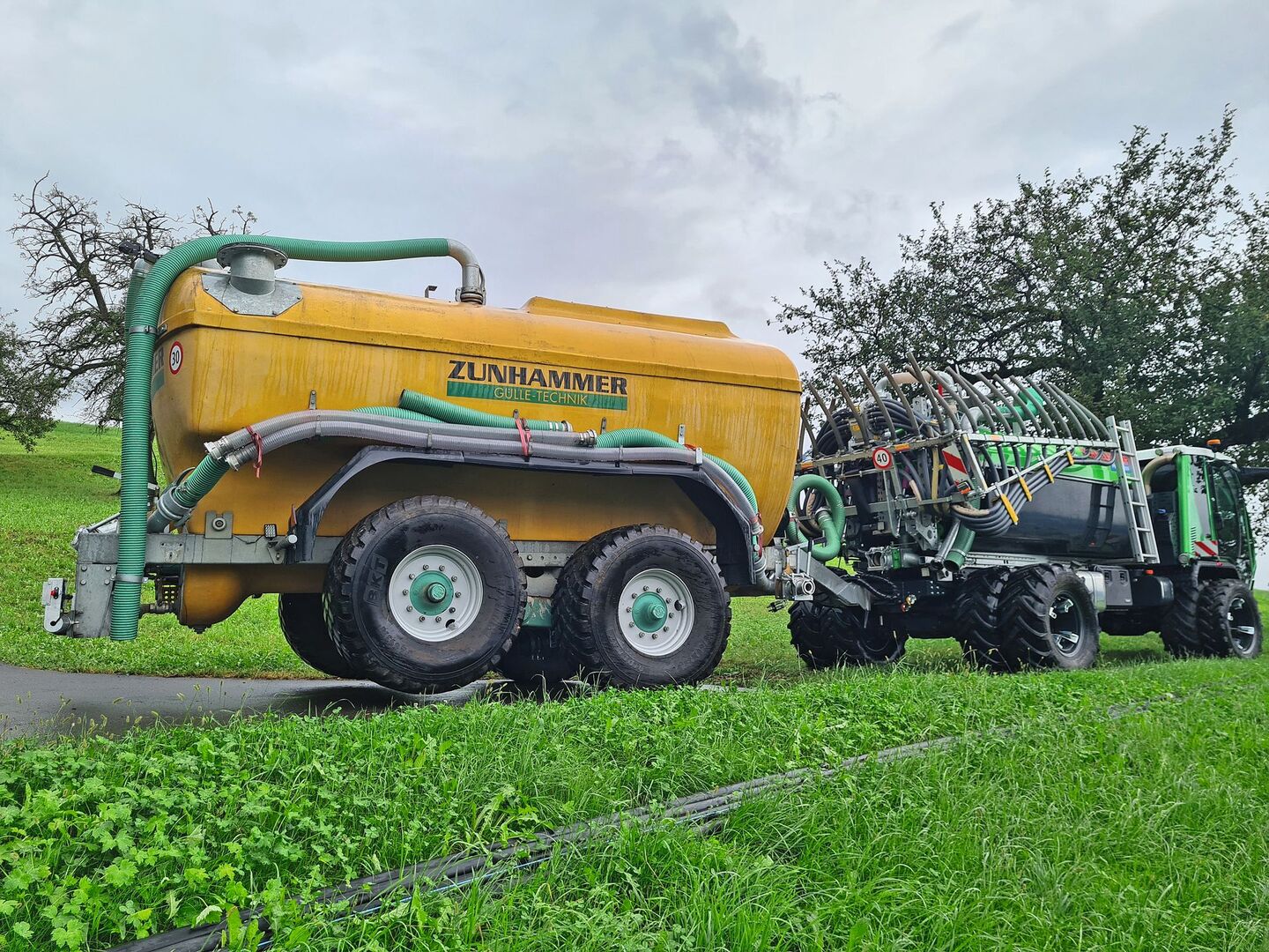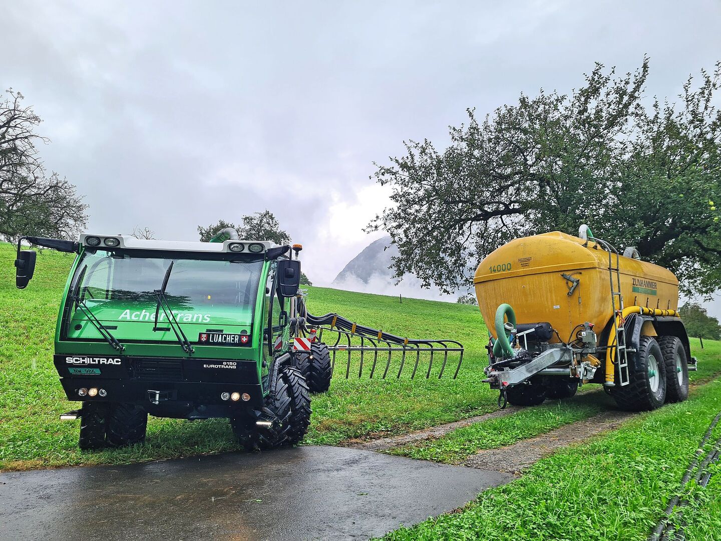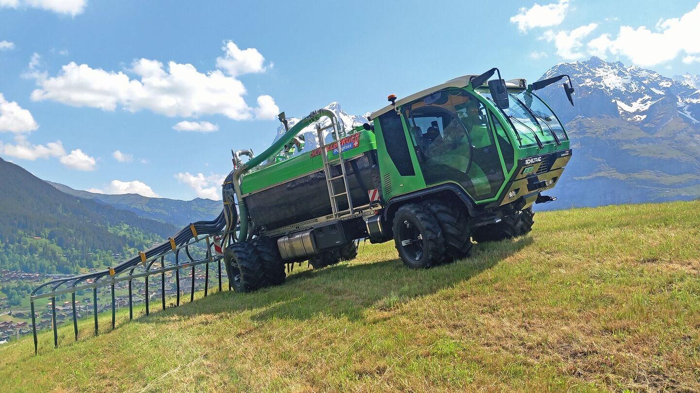 Kurz & bündig -Mit dem Zusatztank auf dem Anhänger kann 19,5 m3 Gülle auf einmal mitgefahren werden. -Das Konzept ist für grosse Hof-Feld-Distanzen geeignet -Am Feldrand wird aus dem Anhängetank Gülle nachgeladen. Mit einem starken Schiltrac und einem Zunhammer-Transportfass güllen Vater Ruedi und Sohn Luca Achermann aus Buochs NW effizient im Berggebiet. Das Aufbaufass auf dem Transporter hat ein Fassungsvermögen…