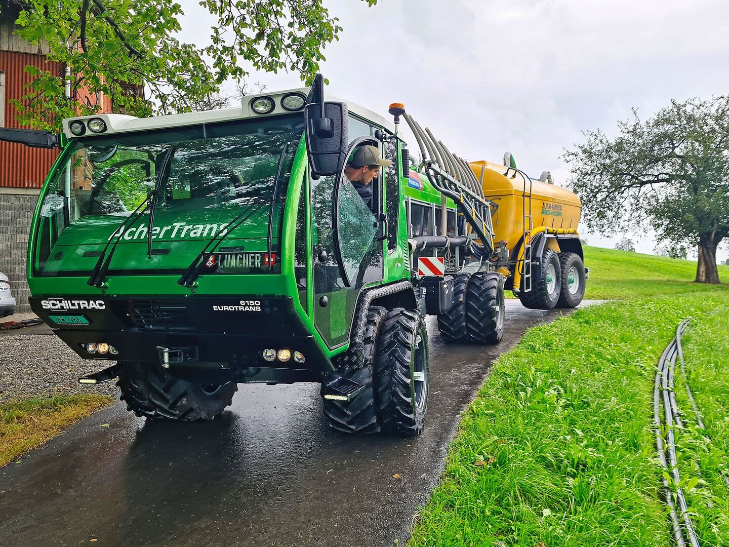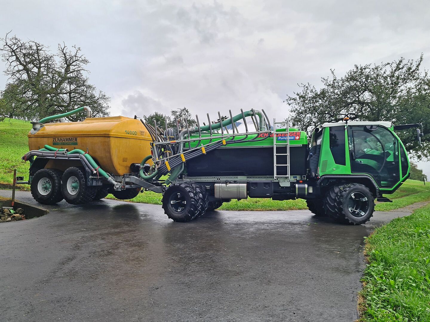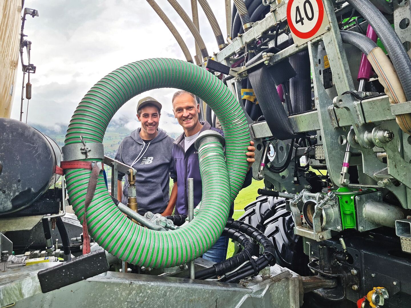Kurz & bündig -Mit dem Zusatztank auf dem Anhänger kann 19,5 m3 Gülle auf einmal mitgefahren werden. -Das Konzept ist für grosse Hof-Feld-Distanzen geeignet -Am Feldrand wird aus dem Anhängetank Gülle nachgeladen. Mit einem starken Schiltrac und einem Zunhammer-Transportfass güllen Vater Ruedi und Sohn Luca Achermann aus Buochs NW effizient im Berggebiet. Das Aufbaufass auf dem Transporter hat ein Fassungsvermögen…