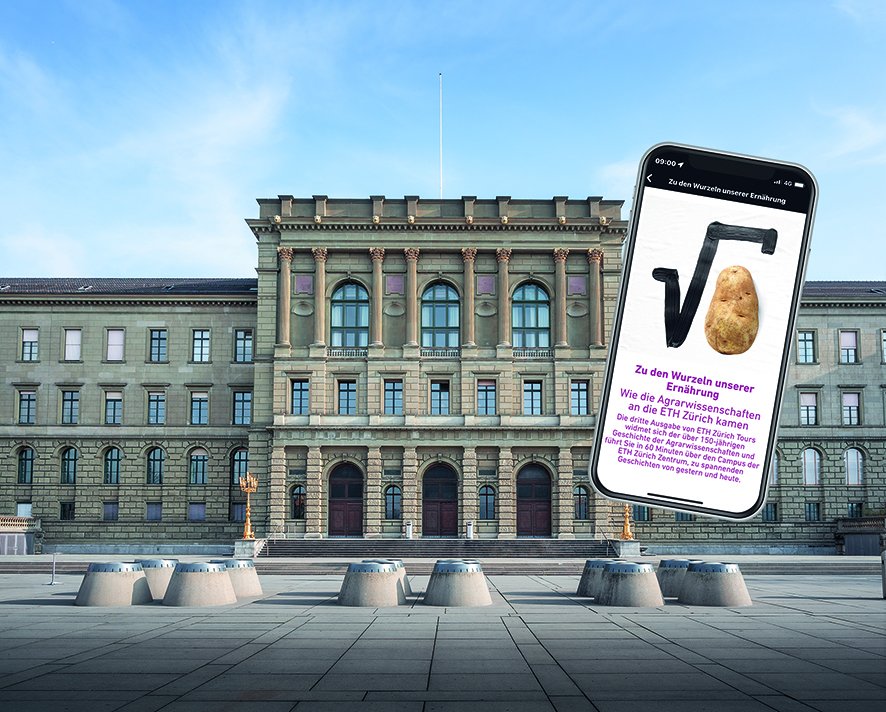 Die auf das eigene Smartphone heruntergeladene ETH Zürich Tours-App führt die Besucher vom Eingang der ETH an der Rämistrasse 101 «Zu den Wurzeln unserer Ernährung».