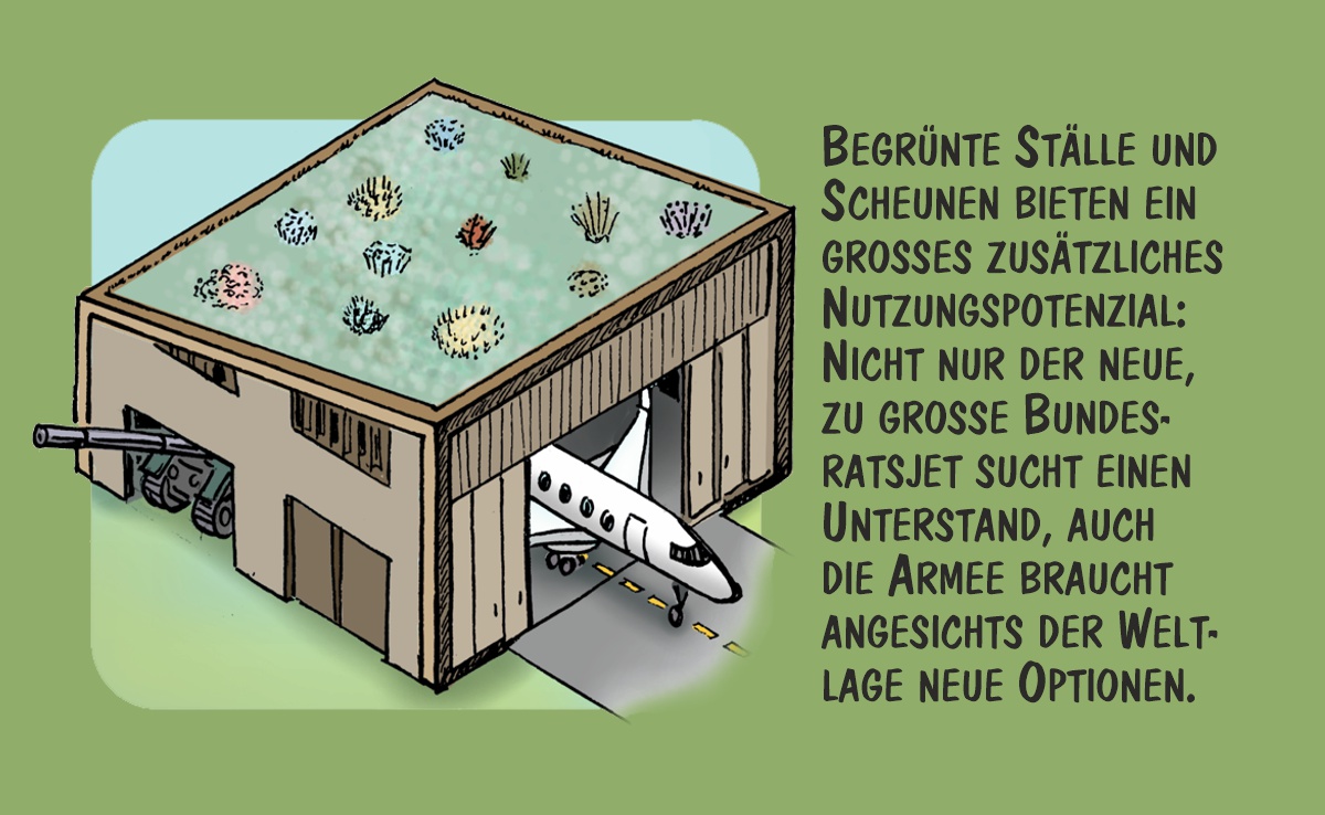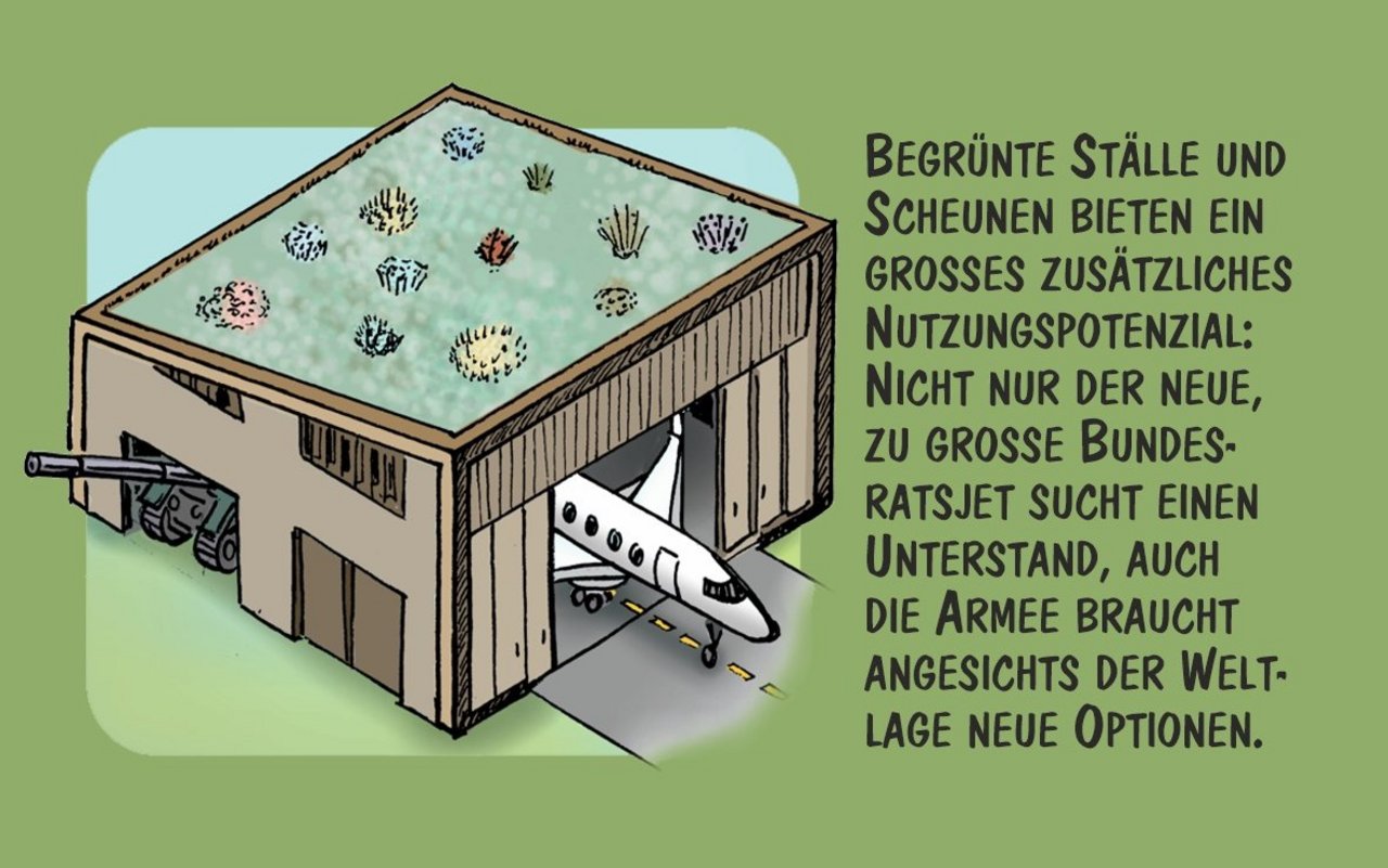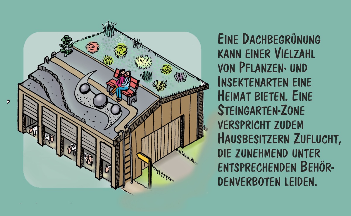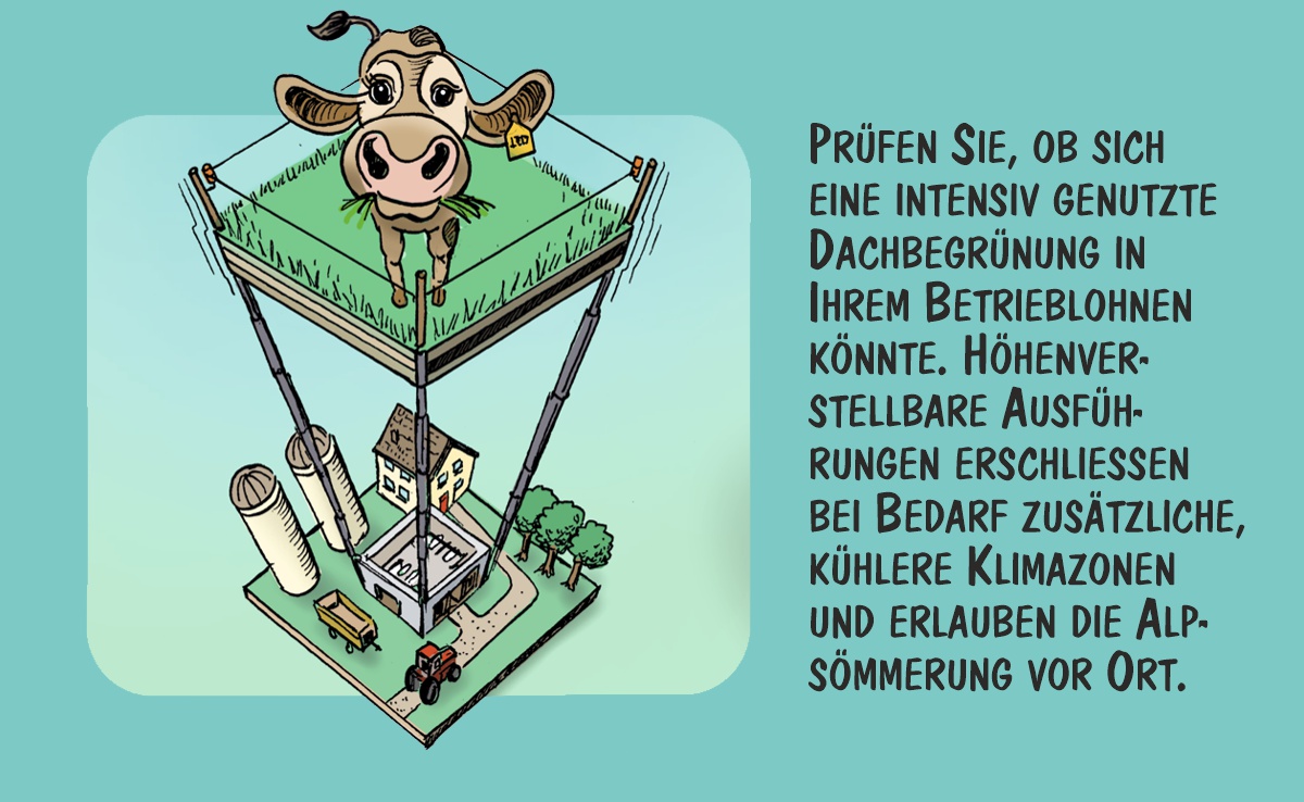 Cartoon von Marco Ratschiller/Karma: Vier Vorschläge für begrünte Stalldächer