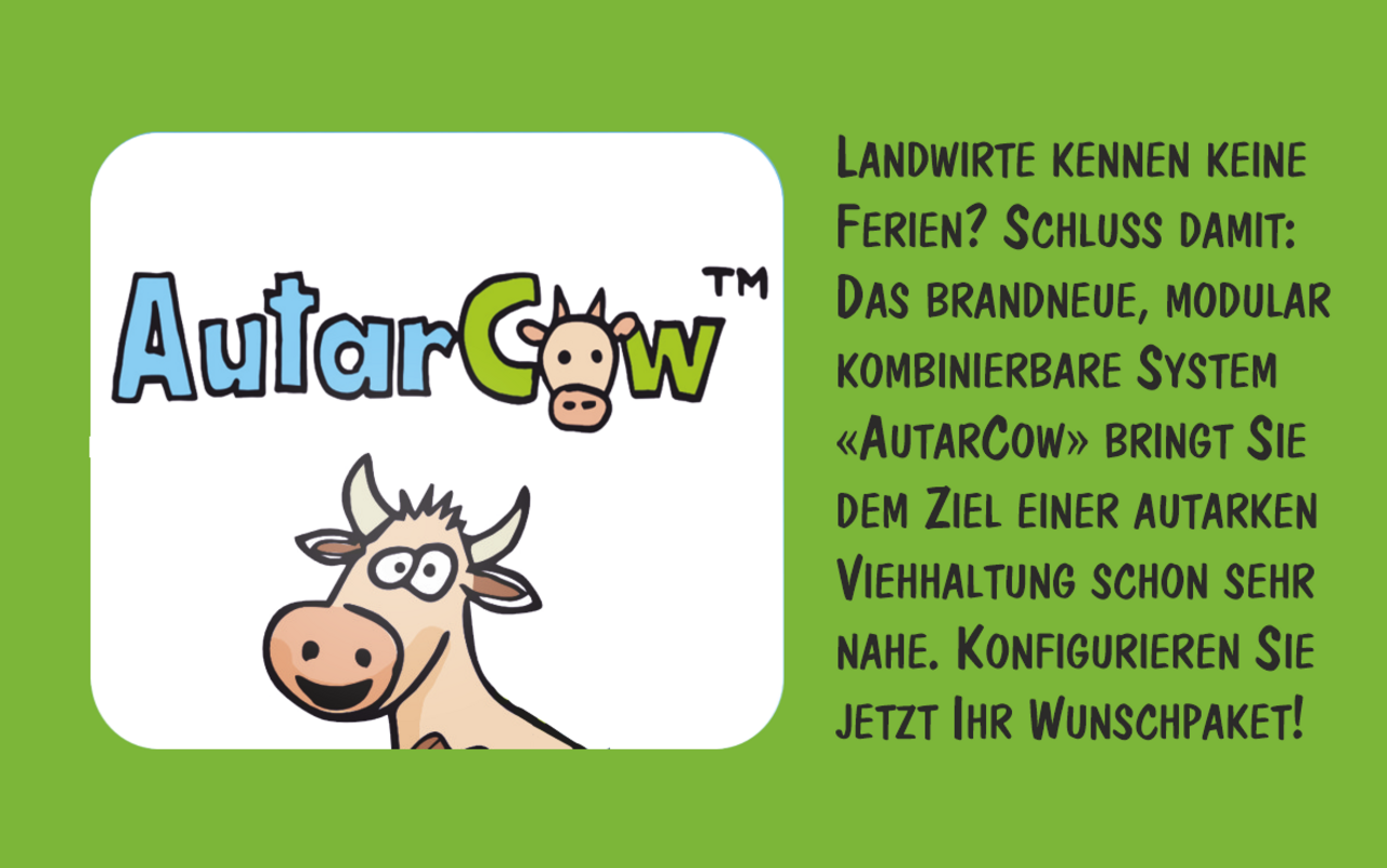 Landwirte kennen keine Ferien? Schluss damit: Das brandneue, modular kombinierbare System «AutarCow» bringt Sie dem Ziel einer autarken Viehhaltung schon sehr nahe. Konfigurieren Sie jetzt Ihr Wunschpaket!