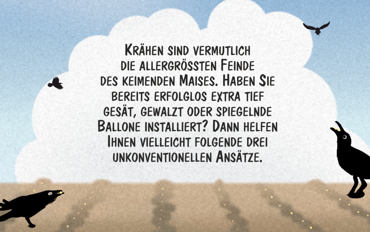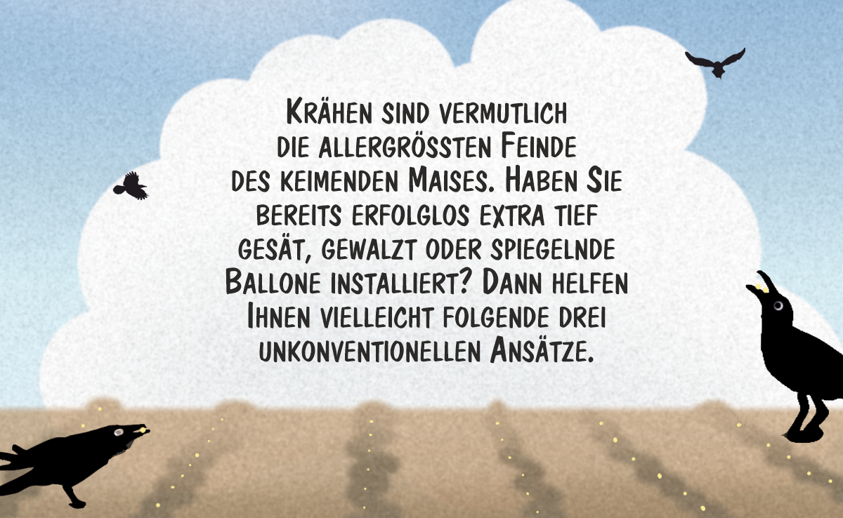 Krähen sind vermutlich die grössten Feinde des keimenden Maises. Haben Sie es bereits erfolglos extratief gesät, gewalzt oder spiegelnde Ballone installiert? Marco Ratschiller/Karma zeigt drei unkonventionelle Ansätze auf.