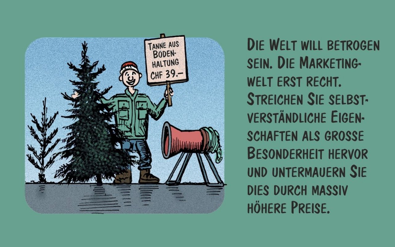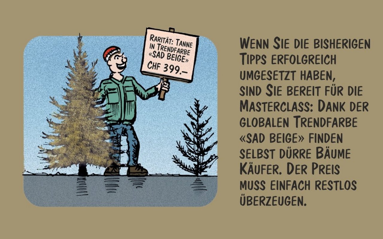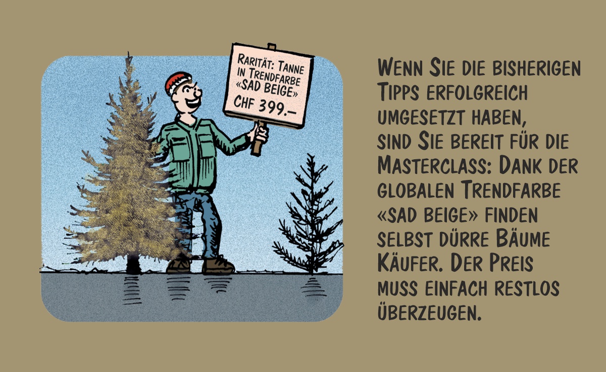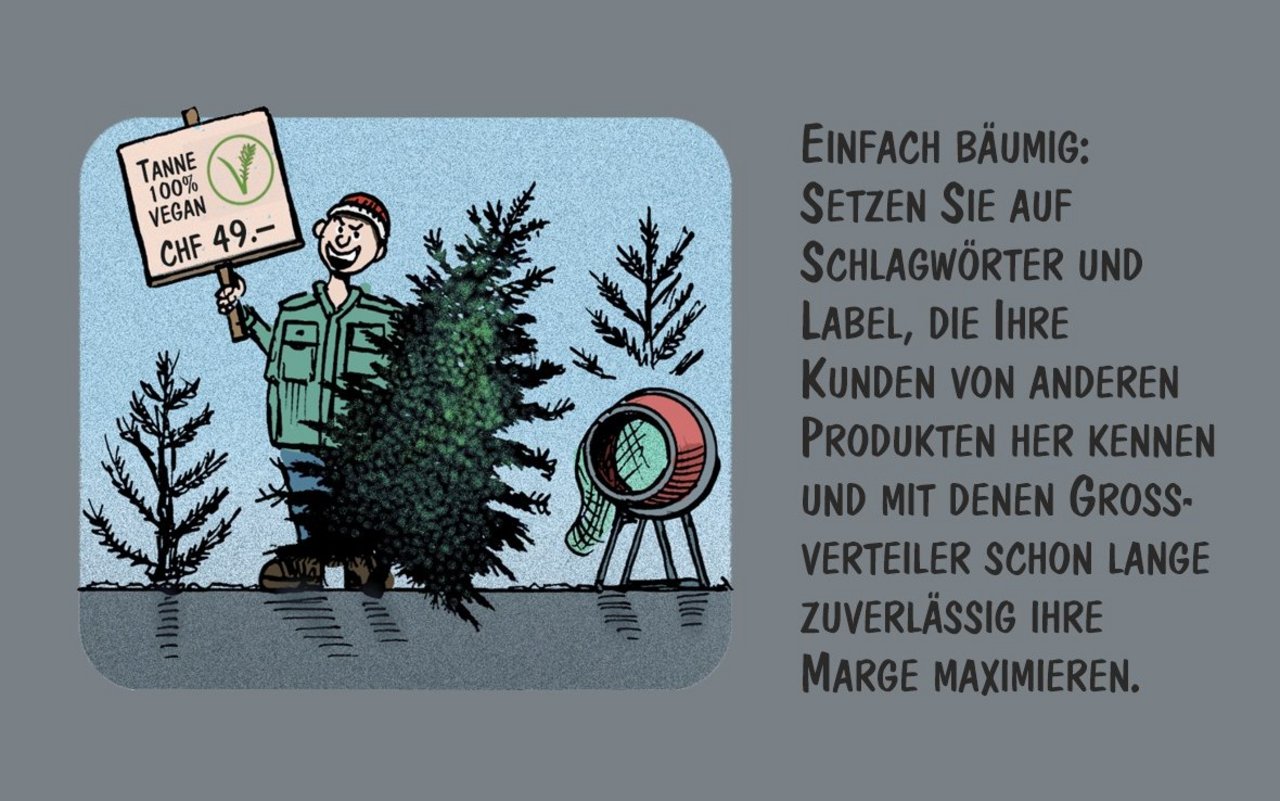 Cartoon von Marco Ratschiller/Karma: Weihnachtsbäume geschickt vermarkten