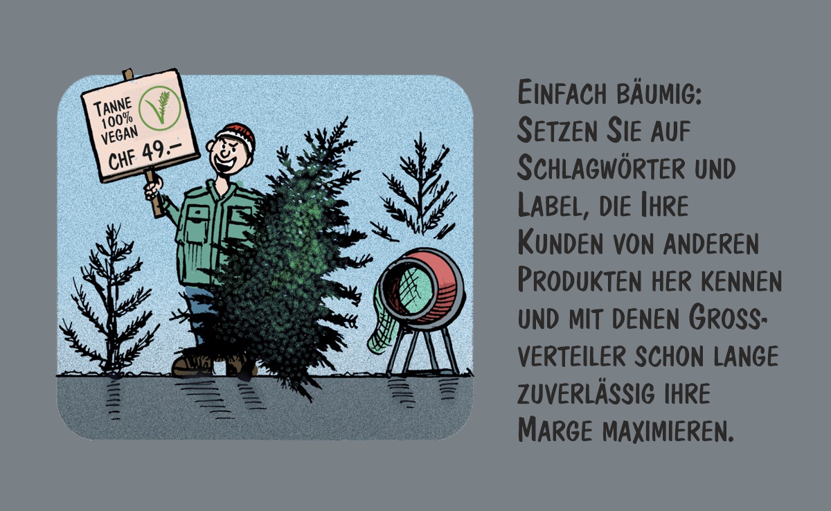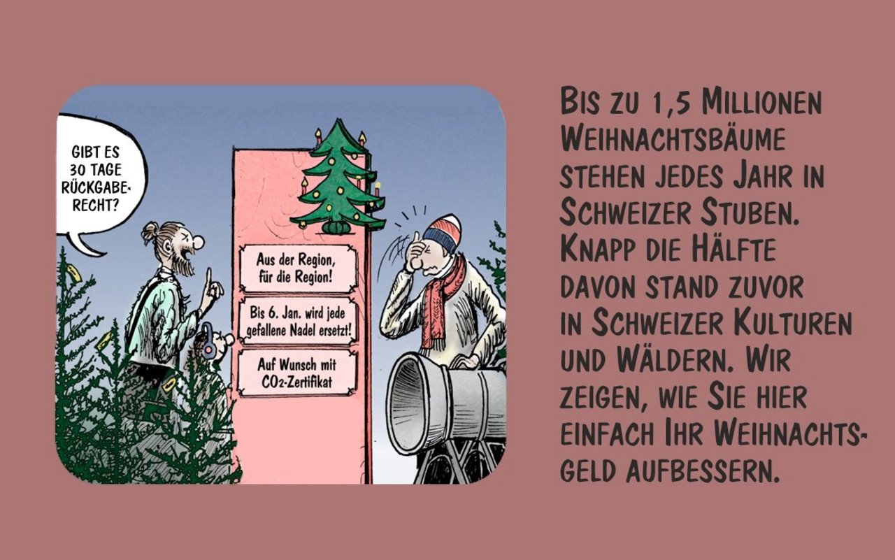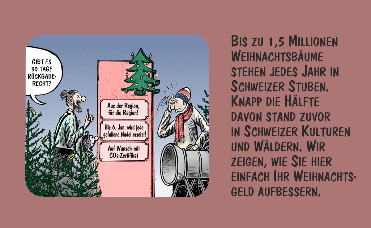Jedes Jahr stehen bis zu 1,5 Millionen Weihnachtsbäume in Schweizer Stuben. Knapp die Hälfte davon ist in Schweizer Wäldern gewachsen. Marco Ratschiller/Karma zeigt, wie sich das Weihnachtsgeld aufbessern lässt.