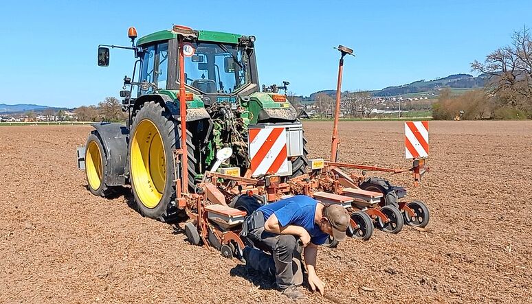 Es geht weiter beim Feldversuch mit den Zuckerrübensorten. Bereits etwas mehr als eine Woche nach der Saat waren die Zuckerrüben sichtbar. Dies dank des bereits stark erwärmten Bodens. Bei der Saat achtete Lohnunternehmer Andreas Zwahlen darauf, dass die Saatkörner möglichst in den noch feuchten Horizont gesät werden konnten und trotzdem nicht zu tief lagen. Bei der Mulchsaat musste er den Schardruck höher einstellen als für den gepflügten Teil.