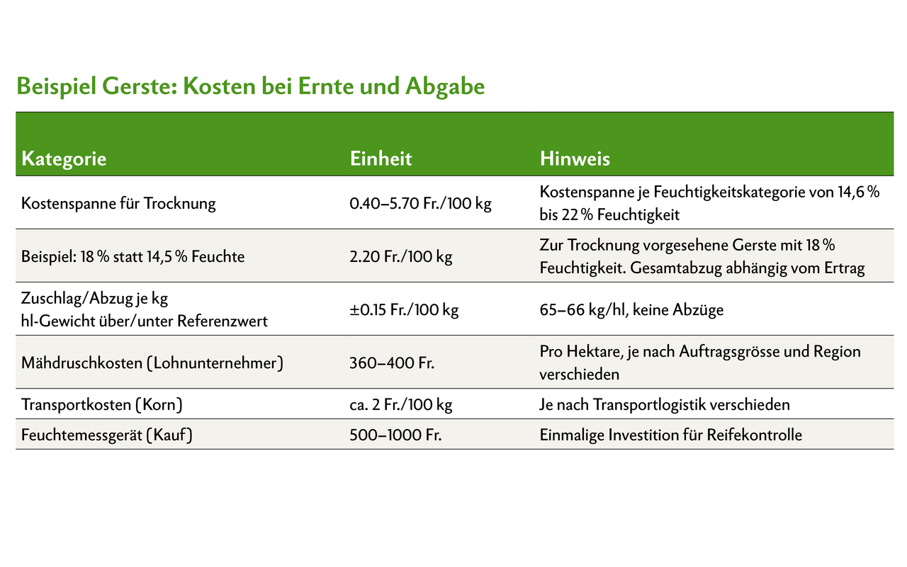 Ein Prozent mehr Feuchtigkeit über dem Schwellenwert verursacht bei der Trocknung fünfmal höhere Kosten als der Abzug für ein zu niedriges Hektolitergewicht. Um 0.75 Fr./100 kg Trocknungskosten auszugleichen für 1 % zu viel Feuchte, müsste das hl-Gewicht mehr als 70 kg/hl erreichen. (siehe Tabelle.)