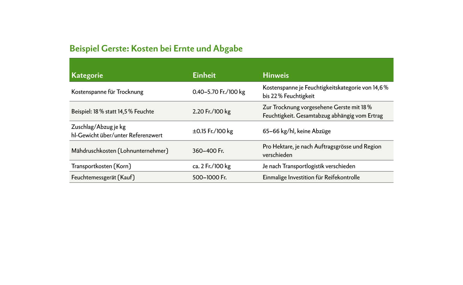 Abzüge fürs hl-Gewicht bei Gerste gibt es unter 65 kg/hl (ca. –0,15 Fr./100 kg), Zuschläge ab 66 kg/hl. Feuchteabzüge beginnen bei 14,6 % und steigen bis zu 5.70 Fr./100 kg bei 22 % Feuchte (ca. 0.75 Fr./100 kg je 1 % über 14,5 %). Ein fiktives Rechenbeispiel: