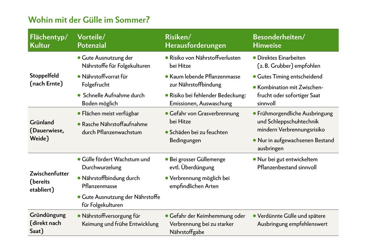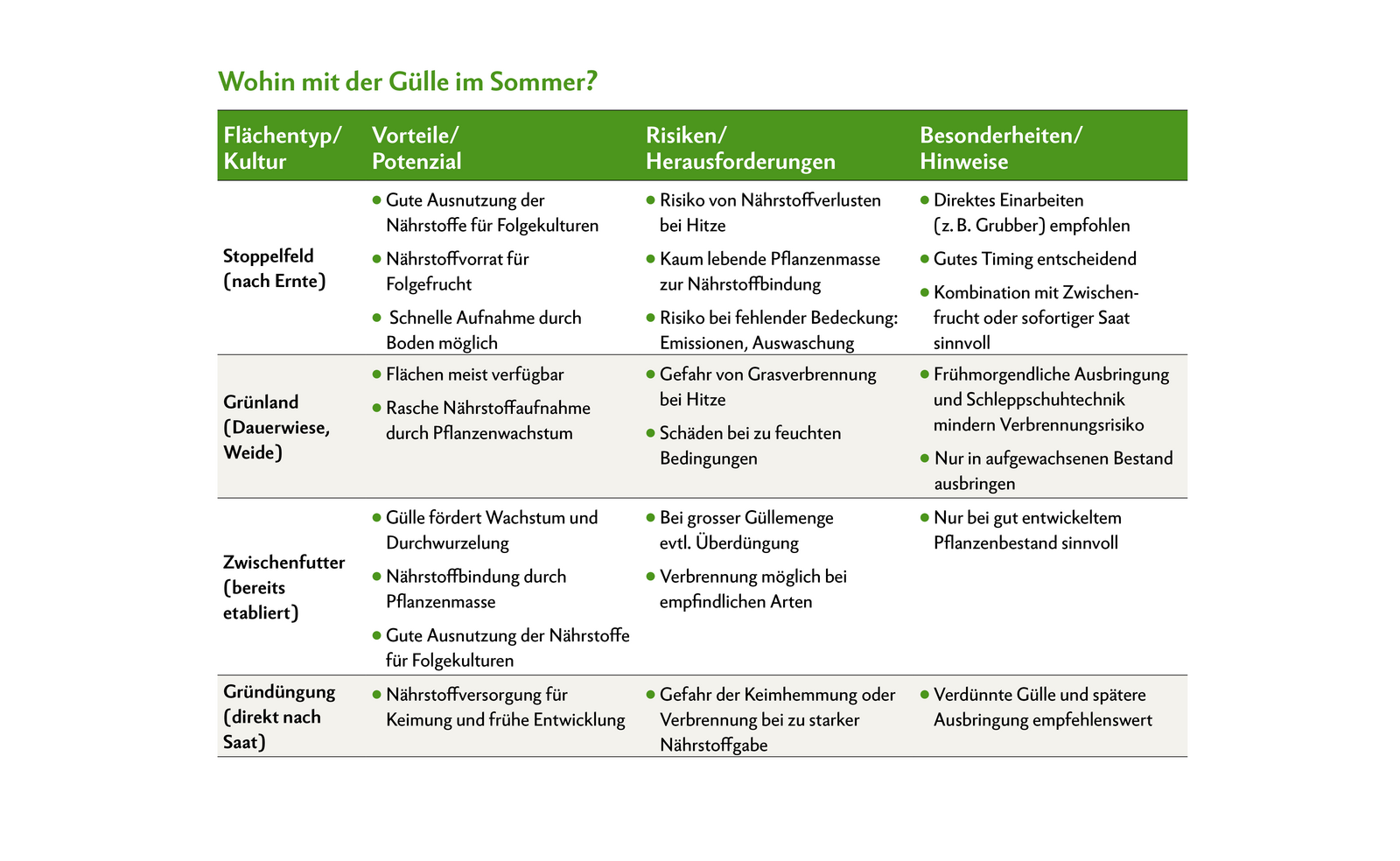 Kurz & bündig-Gülle im Sommer sollte früh am Tag, mit passender Technik und auf geeigneten Flächen wie Stoppelfeldern ausgebracht werden, um Verluste zu minimieren.-Zwischenfrüchte und Grünland binden Nährstoffe gut, wenn sie ausreichend entwickelt sind – auf frisch gemähtem Grünland ist Vorsicht geboten.-Kommen Mist oder Kompost zum Einsatz, sollten sie vollständig ausgereift sein. Die sommerliche Gülleausbringung…
