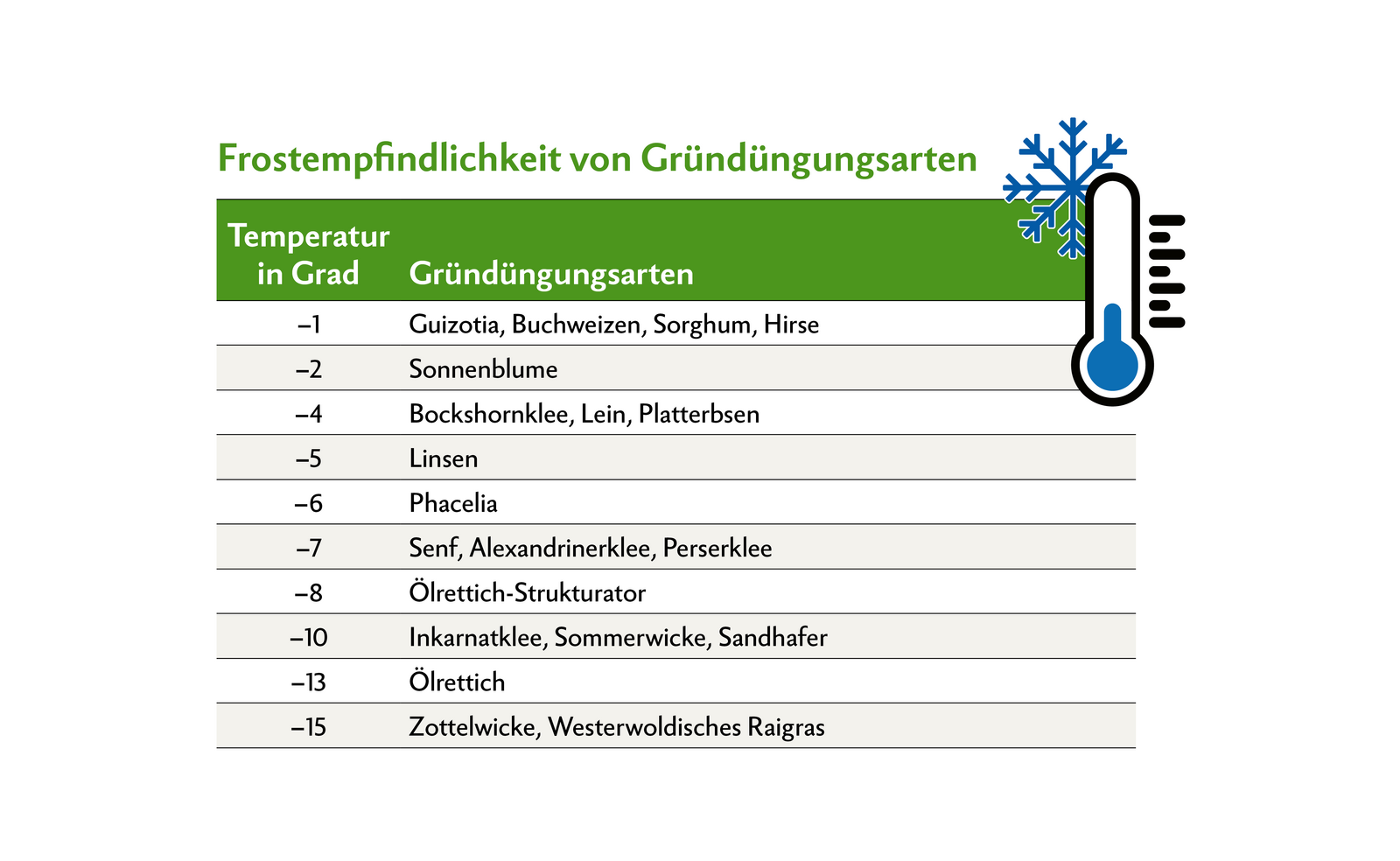 «Phacelia ist hier ein Paradebeispiel. Wird diese drei Wochen früher gesät, friert sie eher ab, als wenn sie nur fausthoch einwintert», sagt Mike Bauert. Nebst Phacelia werden Öl-rettich und Sommerwicken gerne in Gründüngungsmischungen eingesetzt. Diese Arten können Probleme beim Abfrieren bereiten, weil sie ziemlich frosttolerant sind (siehe Tabelle zur Frostempfindlichkeit).
