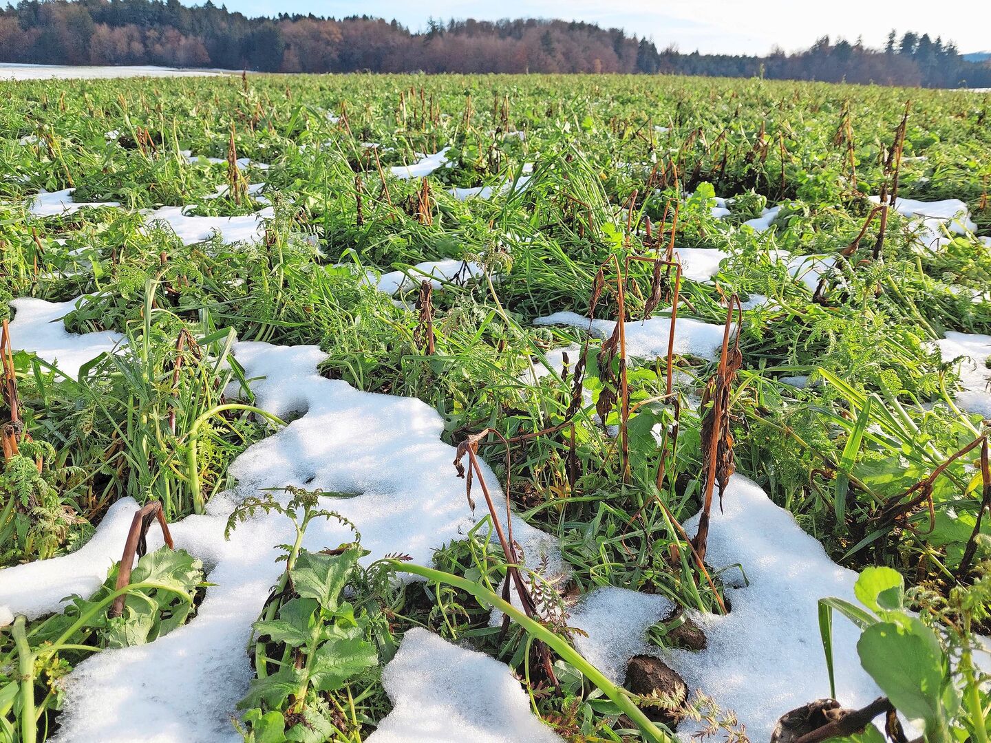 Eine Schneedecke wirkt zusätzlich isolierend, sodass etwas kältetolerantere Pflanzen wie Phacelia und Ölrettich noch schlechter abfrieren (siehe Bild).