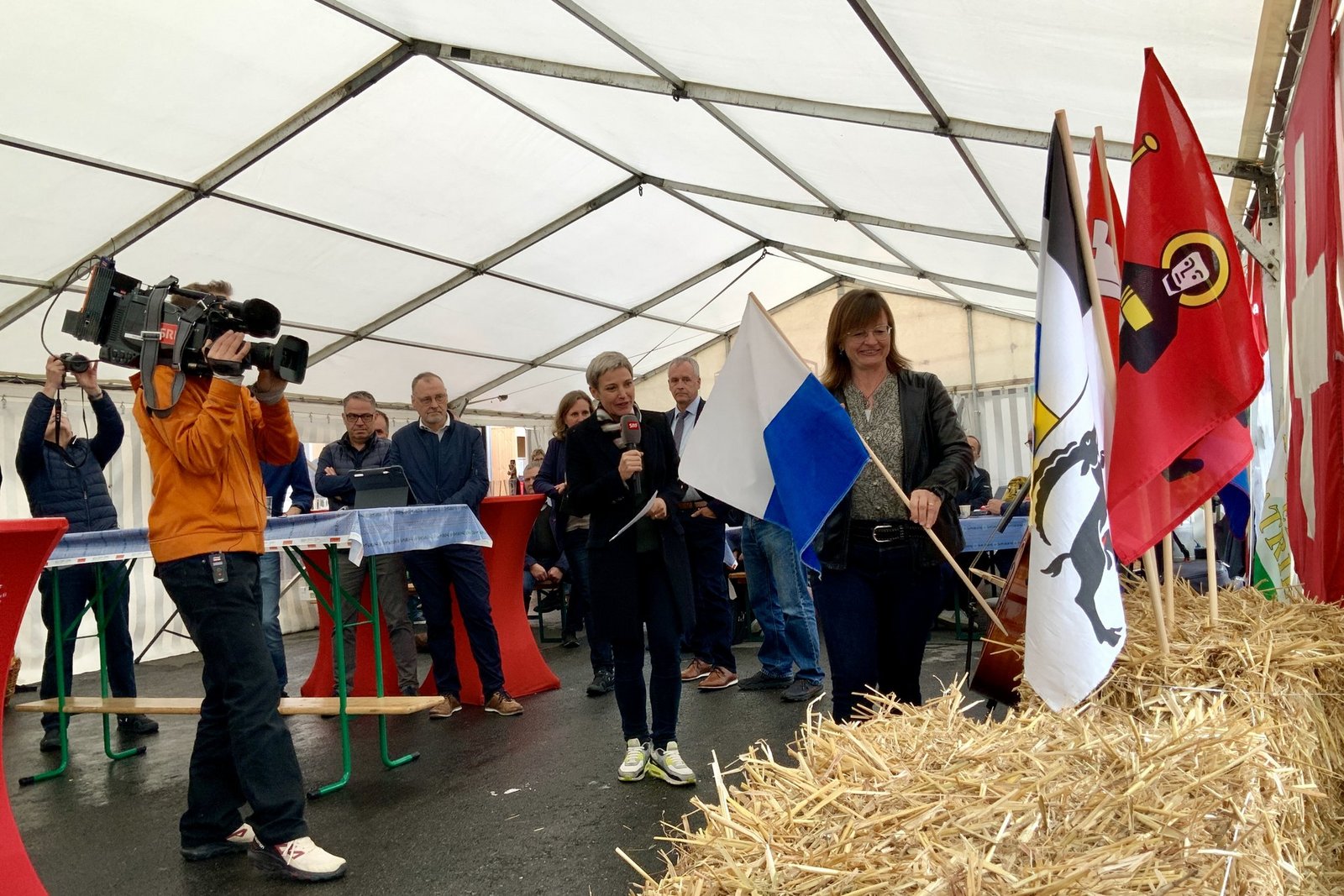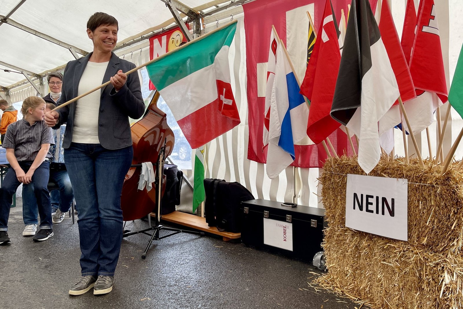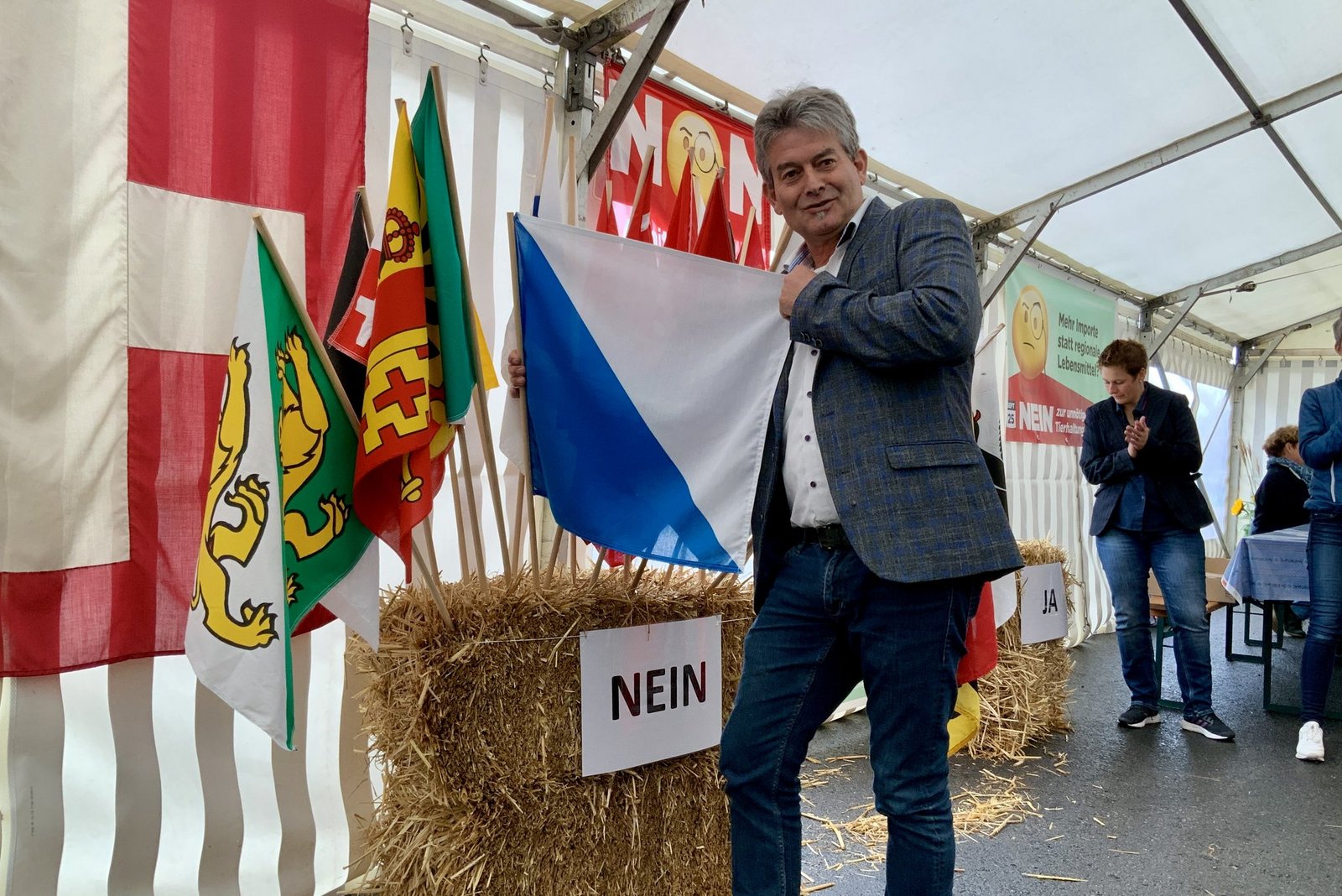 Anne Challande, Präsidentin des Schweizerischen Bäuerinnen- und Landfrauenverbandes, steckt die Fahne ihres Heimatkantons Neuenburg in die Strohballen mit den Nein-Kantonen. Es fehlen nur noch die drei grossen Kantone Zürich, Bern und Waadt. Diese können die aktuellen 64% Nein gegen die Massentierhaltungsinitiative noch ein bisschen senken – aber nicht entscheidend.