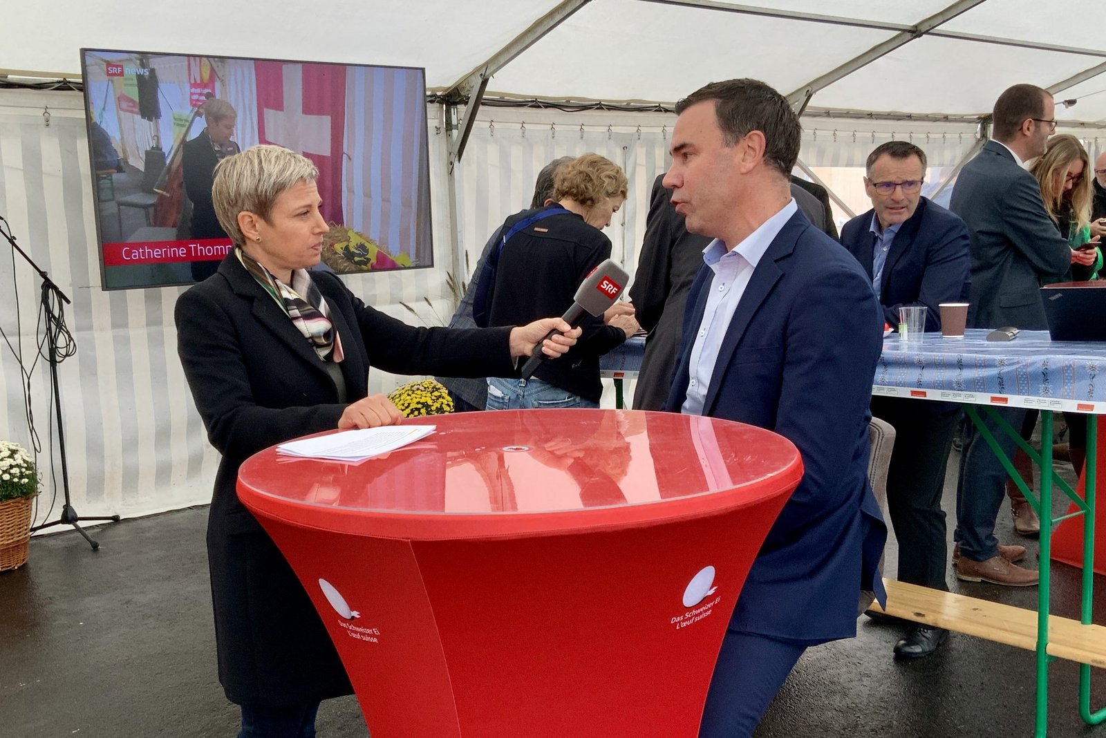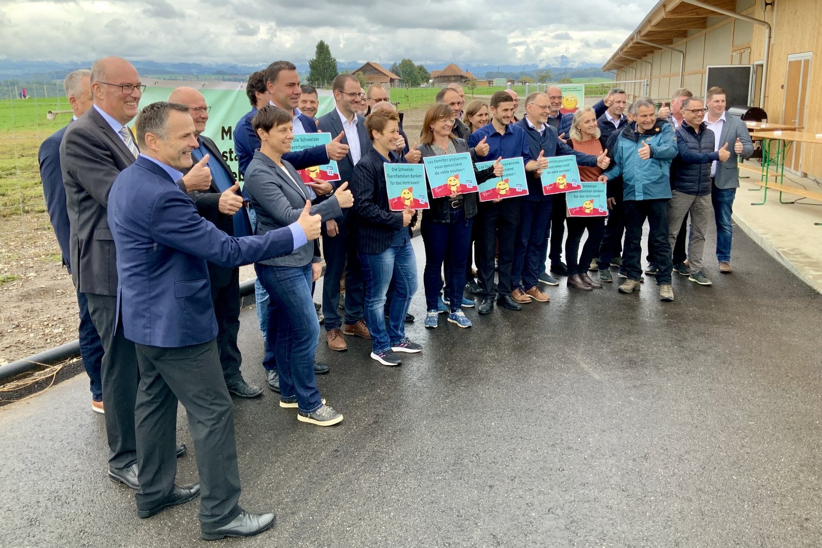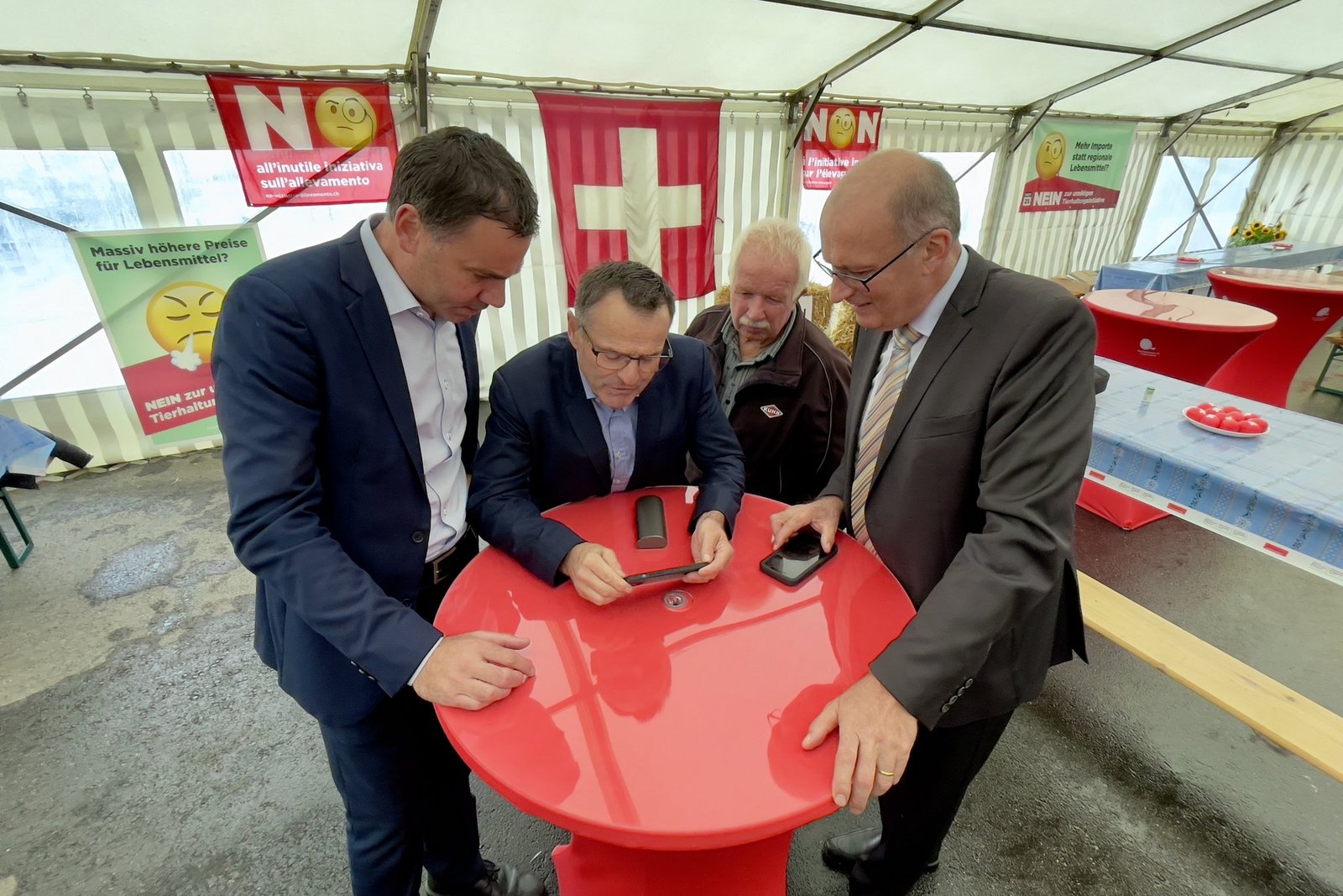 Im Lager der Gegner der Massentierhaltungs-Initiative kommt zum ersten Mal richtig Feierlaune auf. Die Verbandsspitze des Schweizer Bauernverbandes, Vertreter der kantonalen Bauernverbände und Politiker versammeln sich vor dem Stall, in dem über 100 Besucher gespannt die weiteren Resultate erwarten.