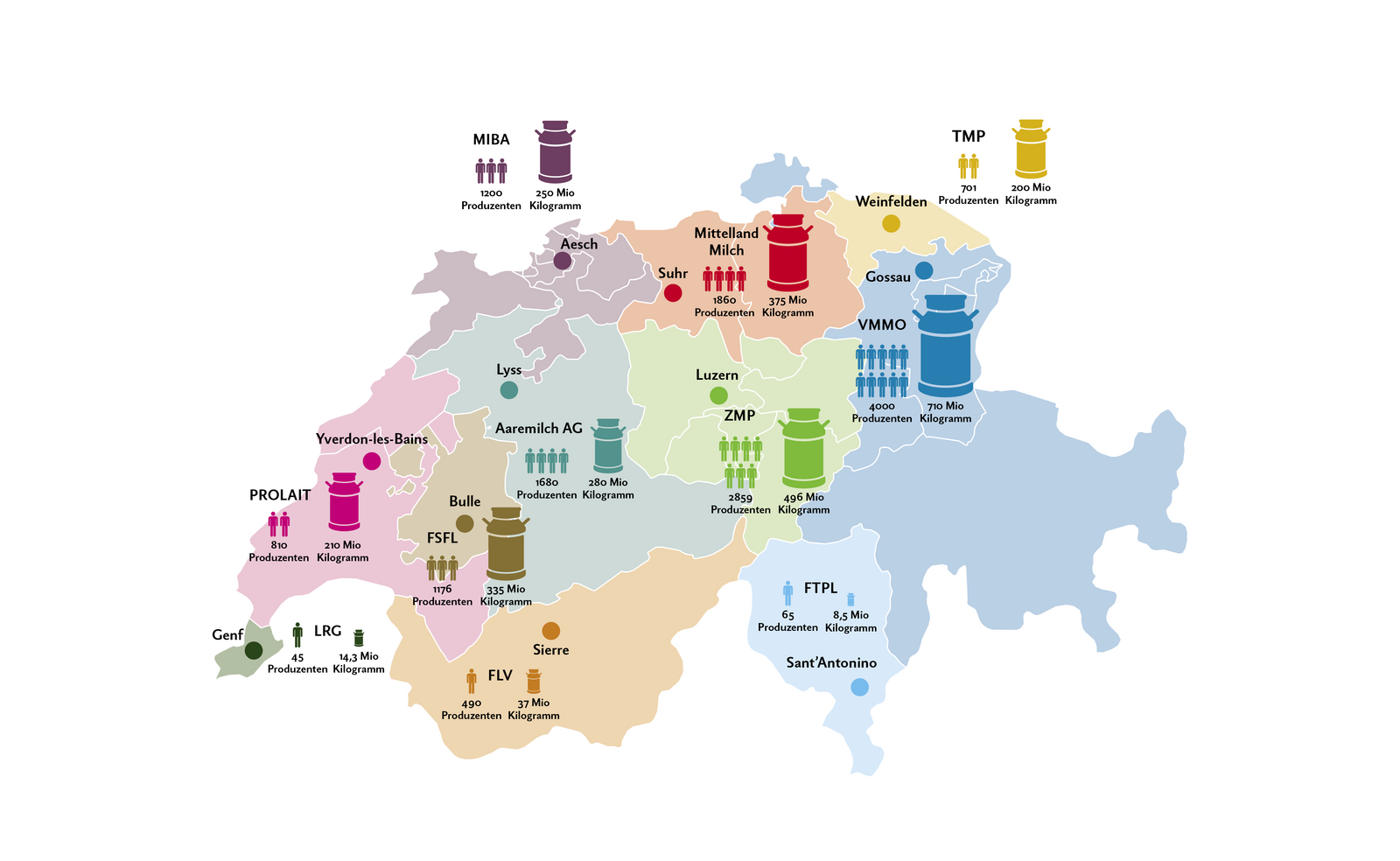 Die nationale Dachorganisation der Schweizer Milchproduzenten SMP ist eine Genossenschaft von elf regionalen Milchproduzentenorganisationen, die wiederum 17'500 Milchproduzenten (Landwirte) vertreten. Unsere Infografik zeigt die Jahresmilchmenge und die Anzahl Milchproduzenten jeder Mitgliedsorganisation sowie deren Einzugsgebiet nach Kantonen (bei geografischen Überschneidungen «besetzt» die jeweils grössere…