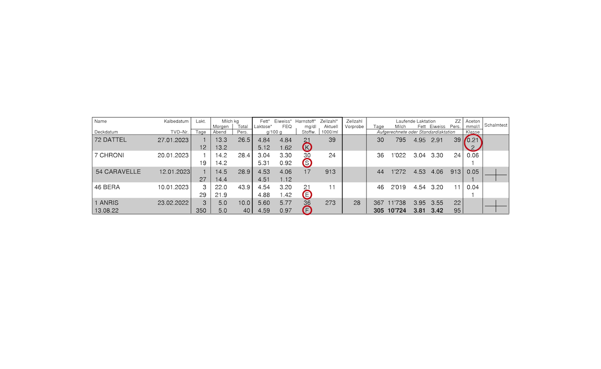 Kurz & bündig - Seit Anfang 2023 ist die überarbeitete MLP im Einsatz. Nebst der neuen Datengrundlage kommt auch ein angepasstes Einzeltier-Datenblatt dazu. - Darin werden Stoffwechselbeeinträchtigungen mit einem Buchstaben ausgewiesen. - Das gibt einen guten ersten Anhaltspunkt für weitere Abklärungen zur Gesundheit der einzelnen Kuh. In der Ergebnistabelle der Milchleistungsprüfung MLP (siehe unten) steht bei der…