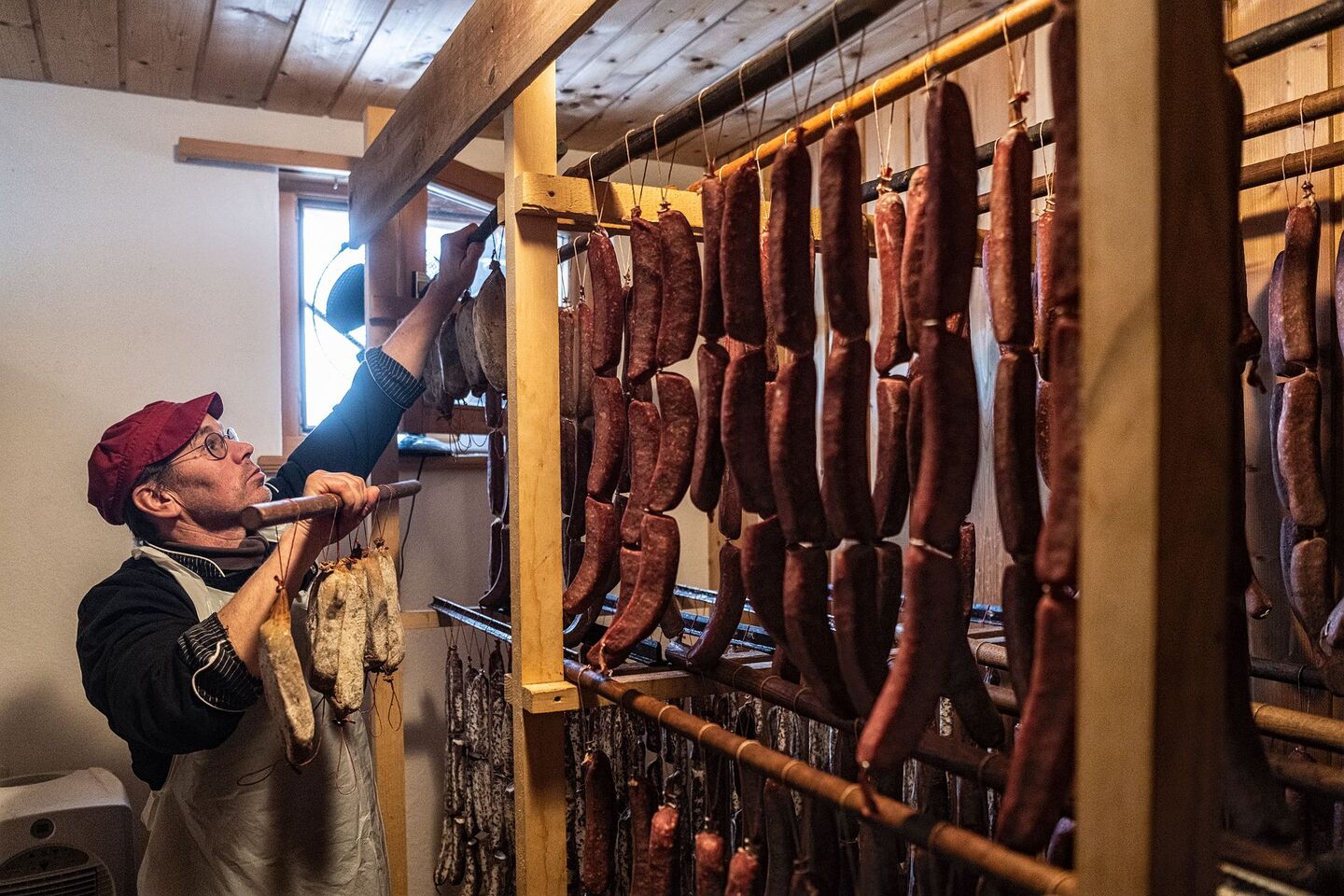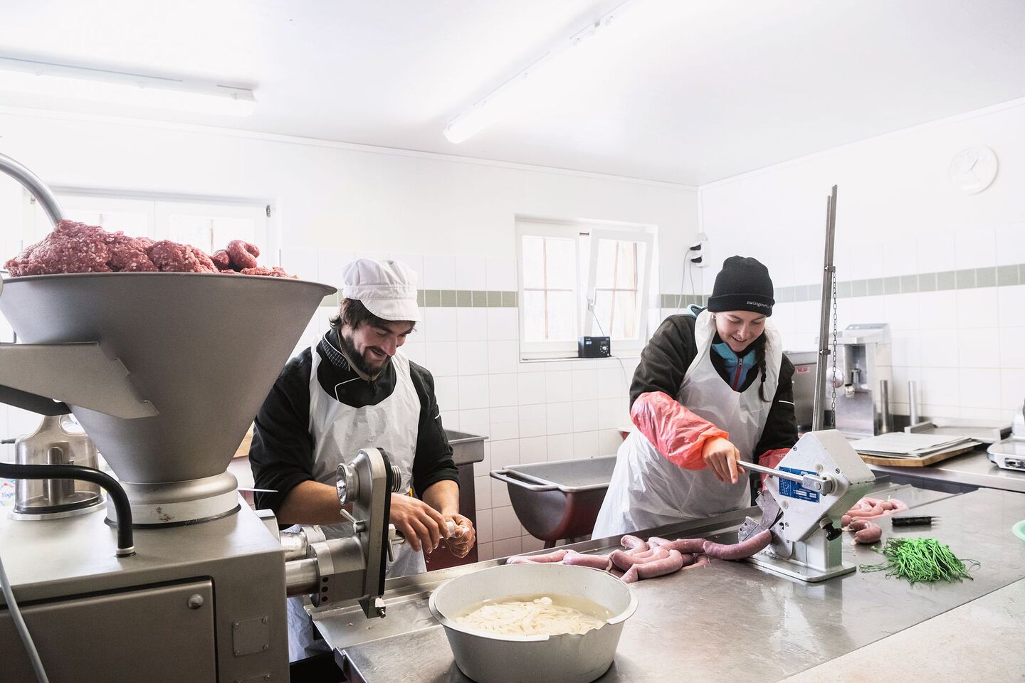 Kurz & bündig - Familie Sprecher bewirtschaftet einen Betrieb mit Mutterkuhhaltung. Das Besondere: Die Bio Natura-Beef und Kühe werden auf dem Betrieb geschlachtet und verarbeitet. - Möglich ist das dank Peter Sprechers Ausbildung zum Metzger sowie der Mithilfe von Familie und Bekannten. - Den Tieren und Menschen wird so eine Stunde Fahrzeit zum nächsten Schlachthof erspart. - Sprechers verkaufen das Fleisch an…