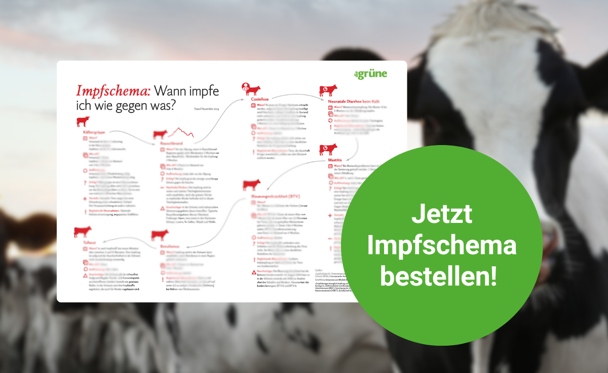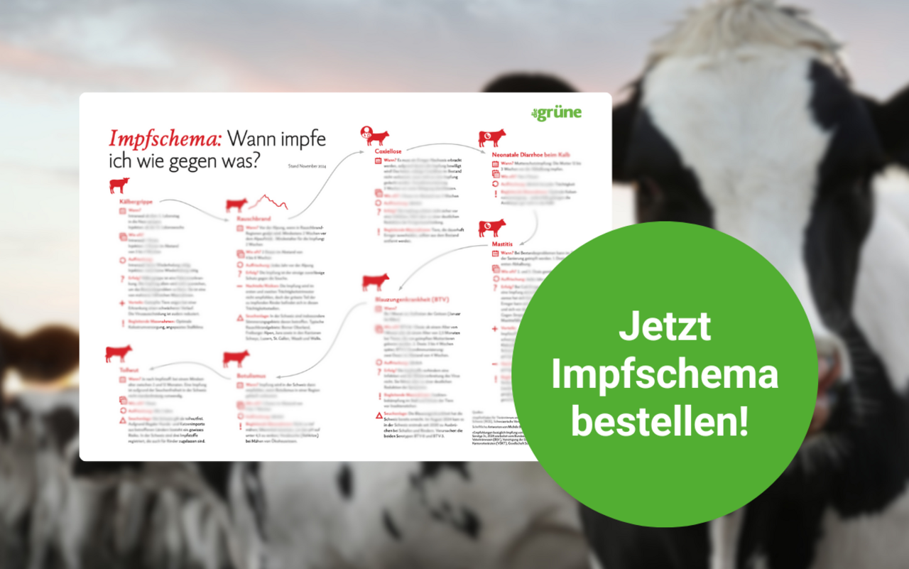 Impfungen stärken das Immunsystem und können den Tieren helfen, sich gegen Krankheitserreger zu wehren. Unser Impfschema gibt eine Übersicht zu den wichtigsten Impfungen im Leben eines Rindviehs. Neben dem Zeitpunkt der Impfung werden Informationen zum Impferfolg, Vor- und Nachteile sowie begleitende Massnahmen aufgezeigt.