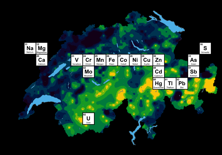 Um die aktuelle Situation der Elementkonzentrationen in den Oberböden der Schweiz besser erfassen zu können, erstellte Agroscope in Zusammenarbeit mit der ETH Zürich, der Eawag und der Arbeitsgruppe «Interventionswerte und Risikobeurteilung (AGIR)» der kantonalen Umweltschutzämter im Auftrag vom Bundesamt für Umwelt einen geochemischen Bodenatlas.