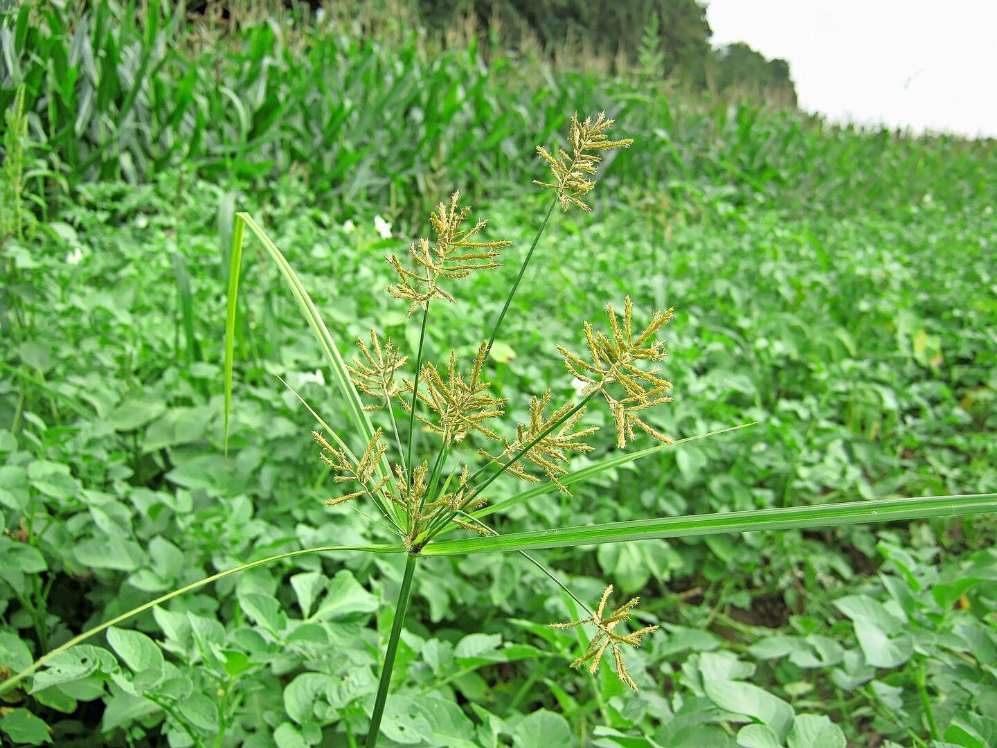 Erdmandelgras ist relativ unauffällig, wenn es nicht blüht. Den invasiven Neophyten erkennt man an dem dreikantigen Blattstängel, der gelbgrünen Farbe und der ausgeprägten Blattspitze. Es vermehrt sich mit langlebigen Knöllchen in bis zu 30 cm Tiefe. Bei Befall ist mit Ertragseinbussen oder sogar mit der Stilllegung der Parzelle zu rechnen. Da Pflanzenschutzmittel nicht vollständig wirksam gegen Erdmandelgras sind, ist Prävention nicht nur für Biobetriebe die einfachste Strategie.
