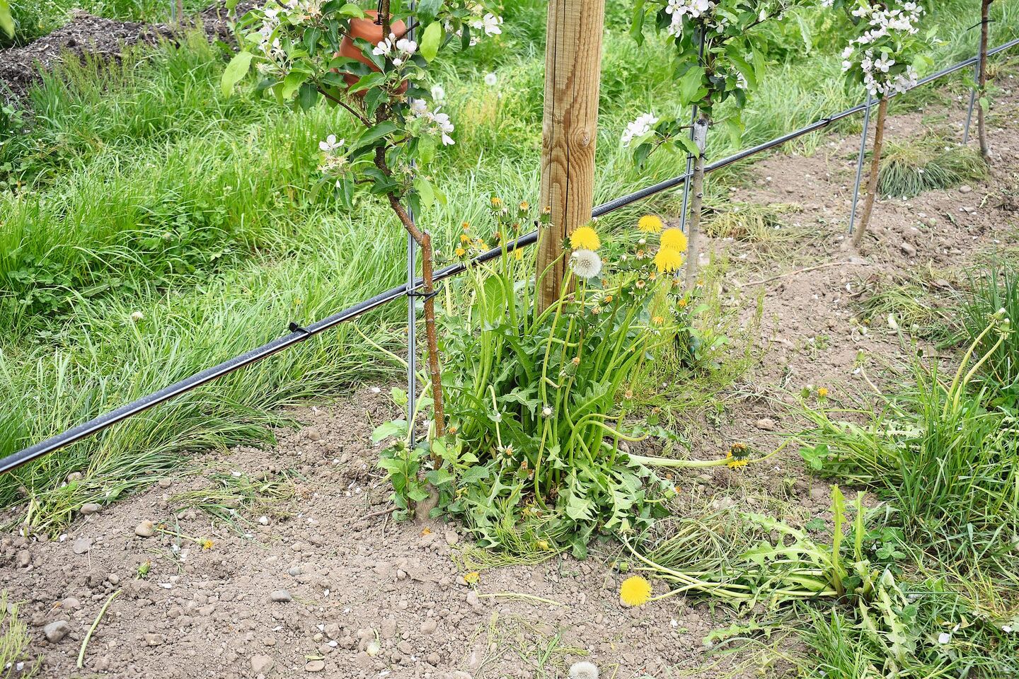 Die Kombination des Hackgeräts «Ladurner» mit einem Fadengerät reguliert die Unkräuter am besten. Im Frühling wird mit dem Hackgerät der Boden geöffnet und dadurch die Unkräuter ausgerissen. Während des Fruchtwachstums kann ein gewisser Unkrautdruck toleriert werden, so dass nur noch die Wuchshöhe reguliert werden muss. Daher ist ab diesem Zeitpunkt das Fadengerät durch die schnellere Fahrgeschwindigkeit die effizientere Wahl.