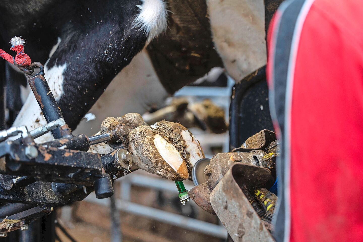 Sobald die Pflege an allen Klauen durchgeführt wurde, wird der Klauenstand wieder gesenkt und die Kuh kann zurück in den Stall.