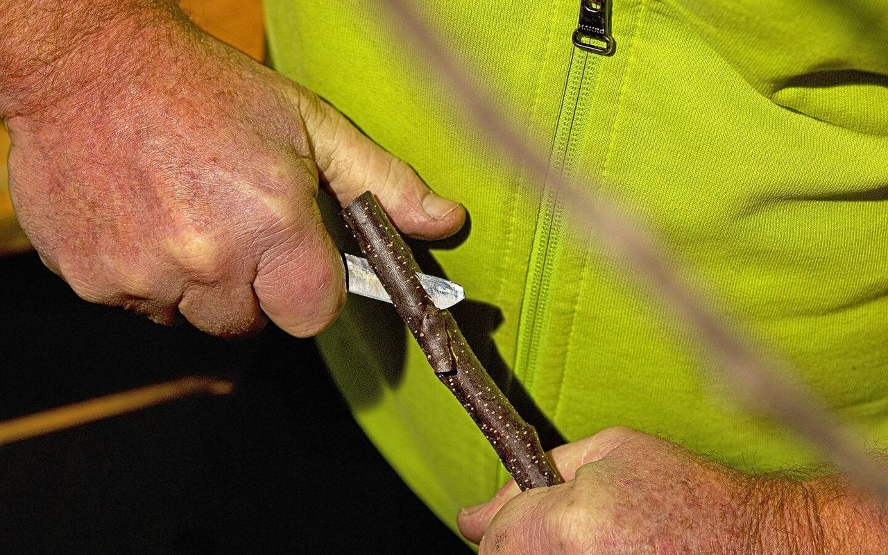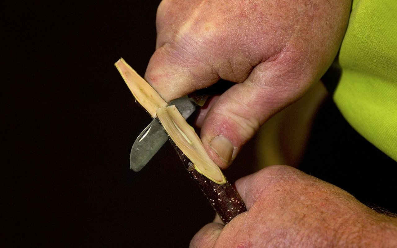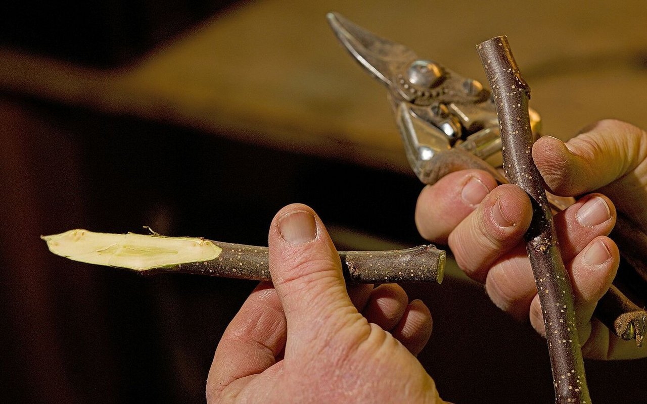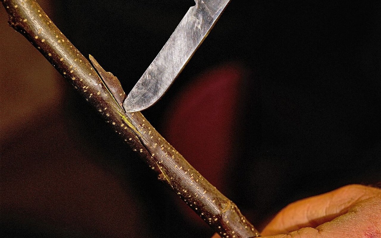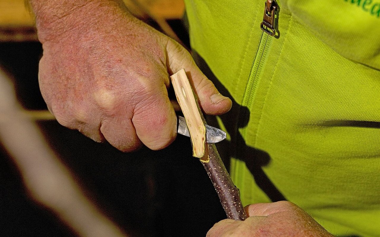 Auch beim Edelreis schneidet Glauser eine Fläche mit einer Gegenzunge.