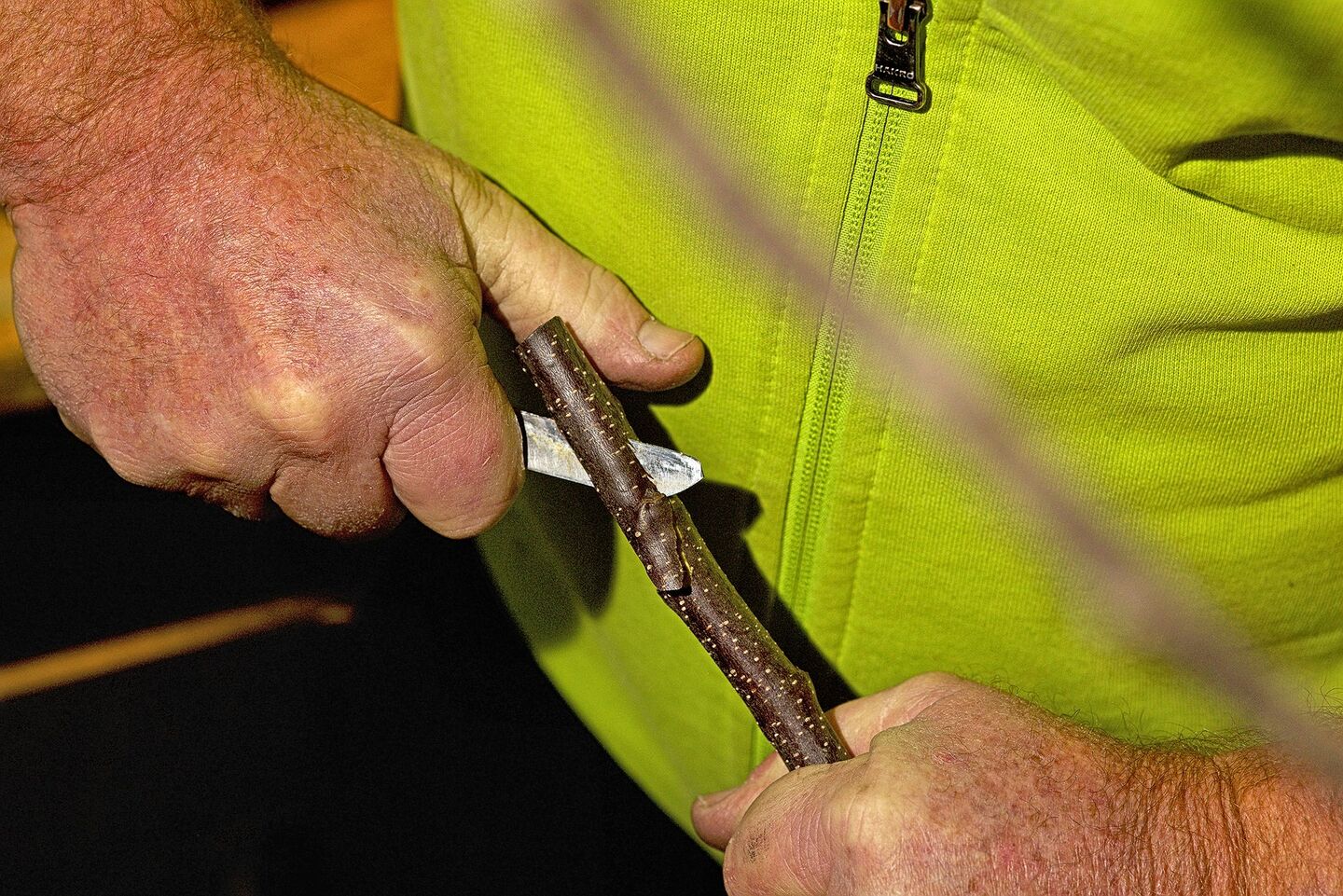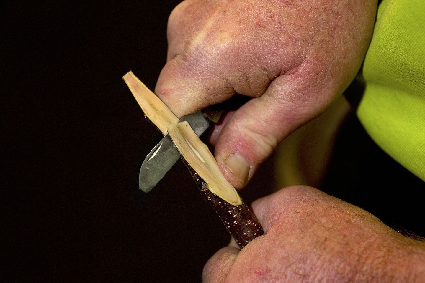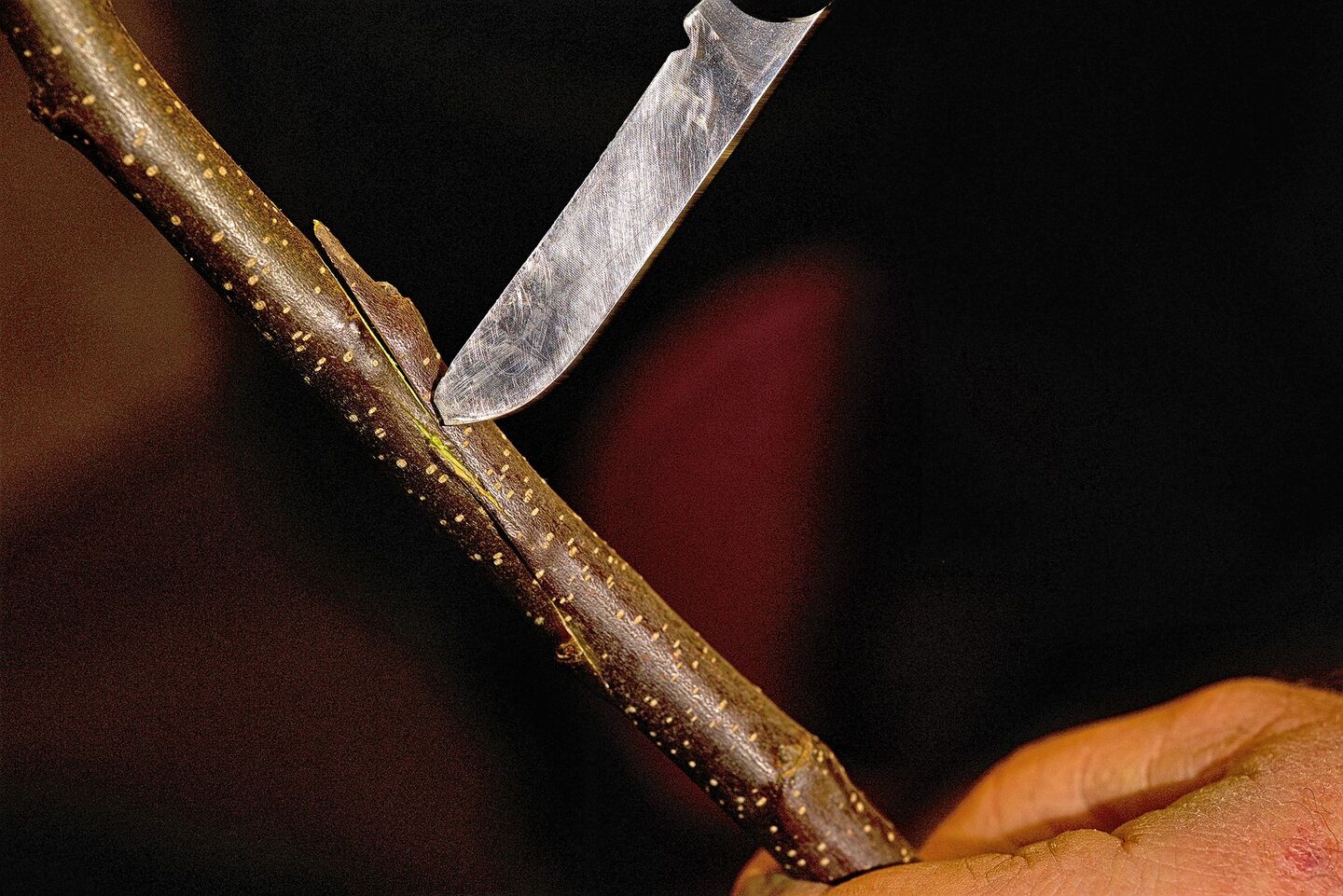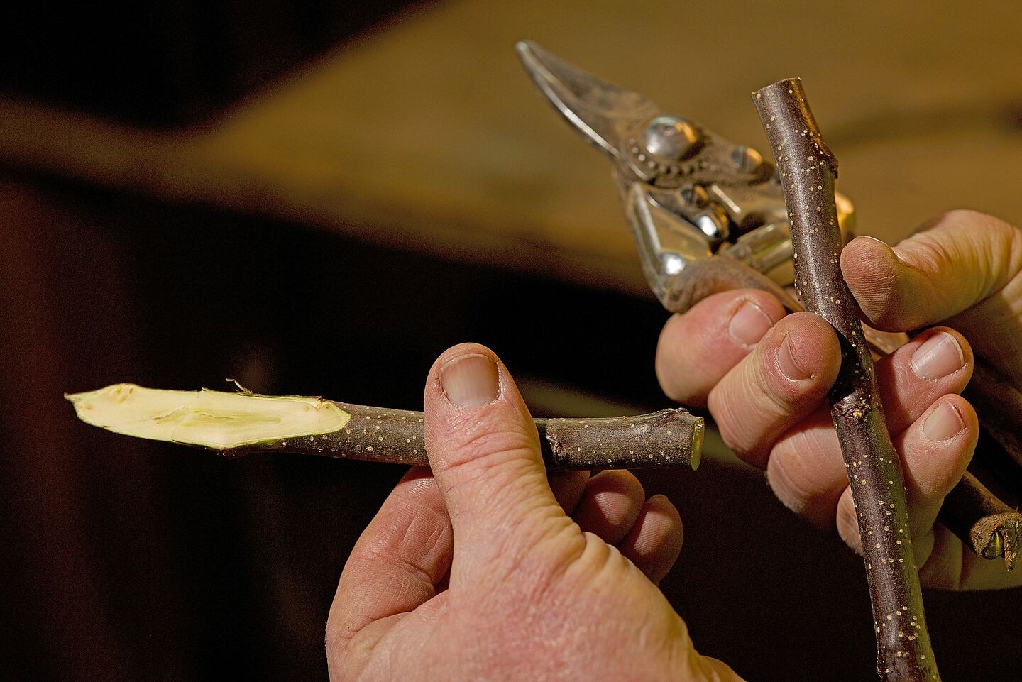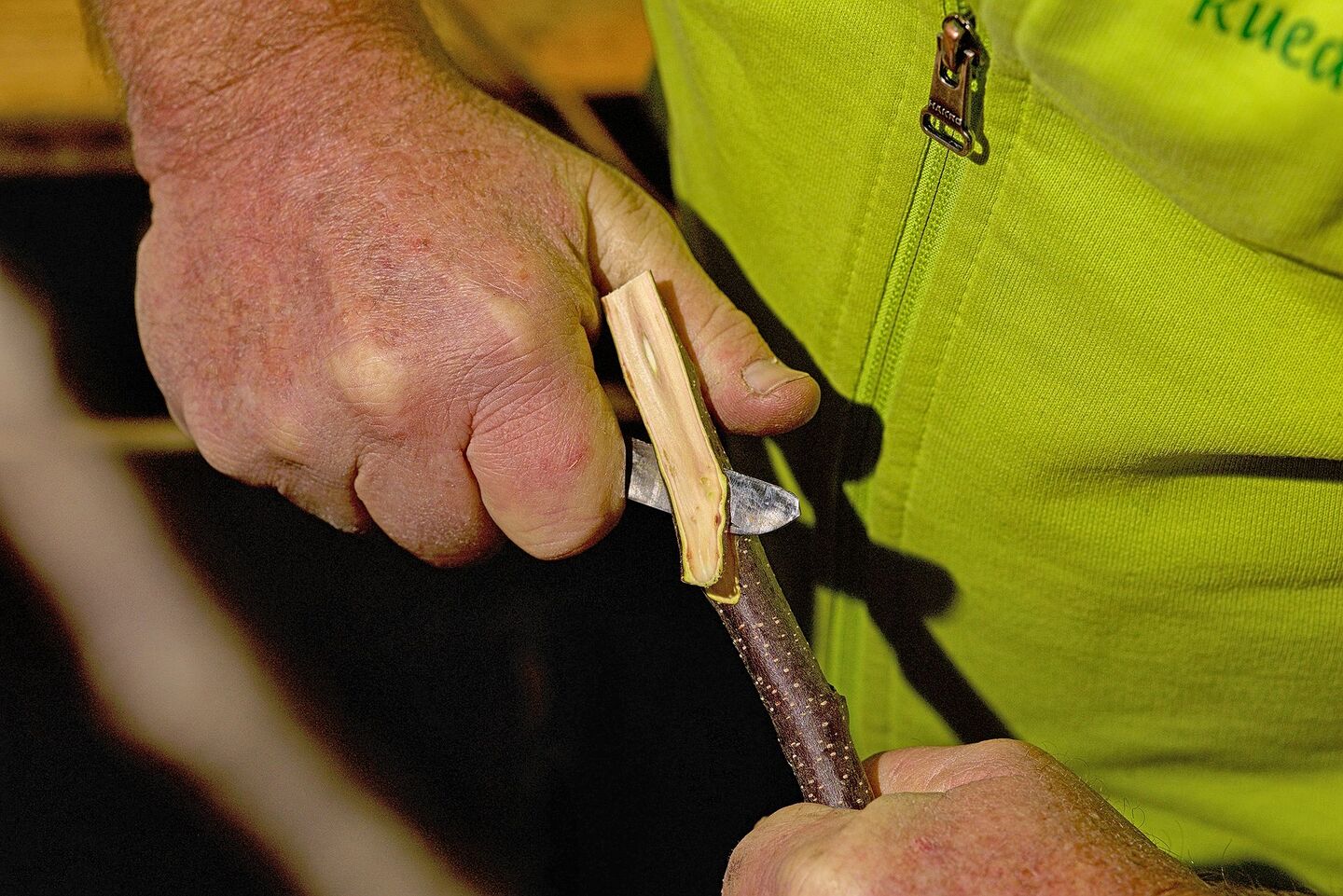 Auch beim Edelreis schneidet Glauser eine Fläche mit einer Gegenzunge.