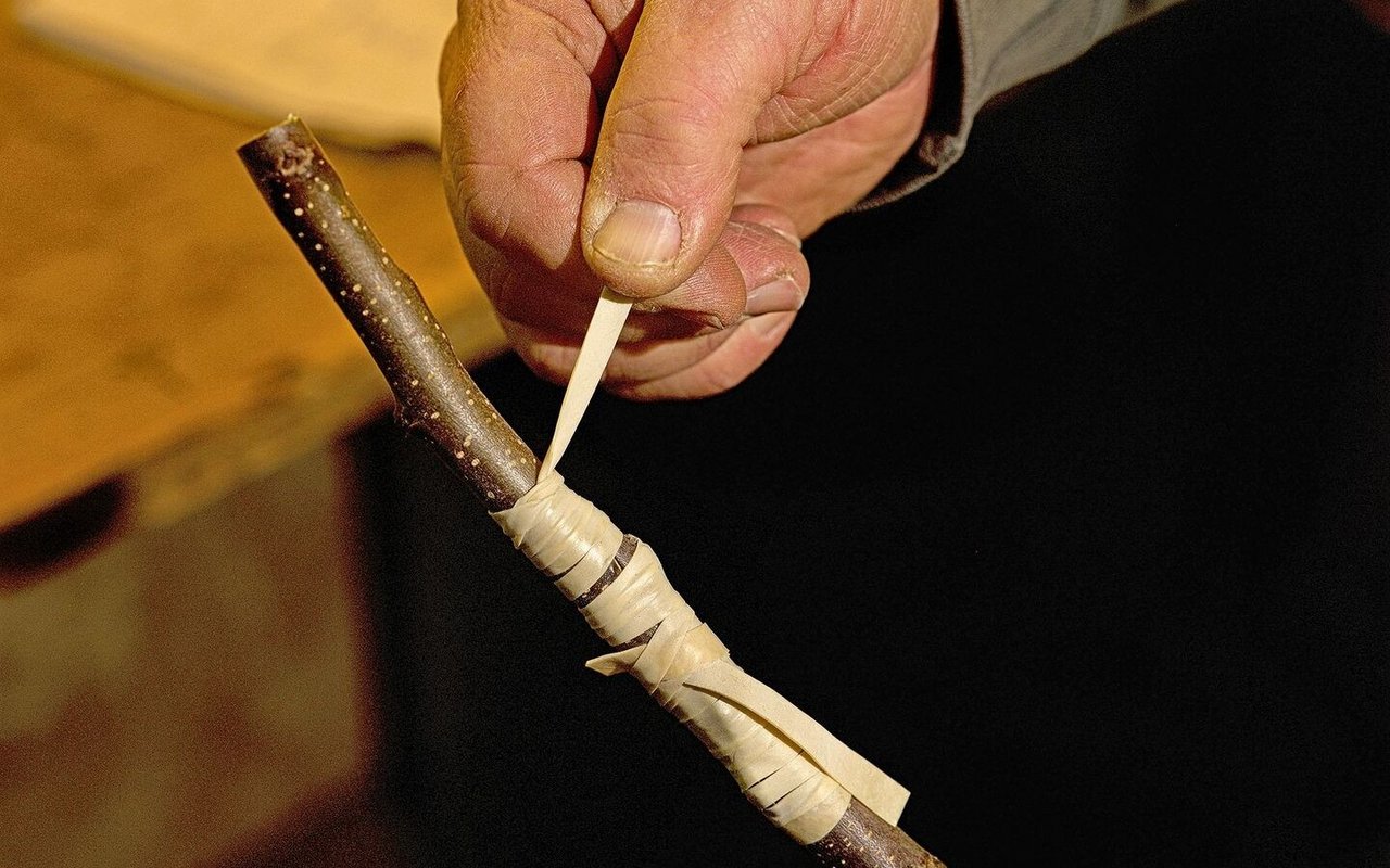 Mit einem Gummiband verbindet Glauser die beiden Stücke und presst so Edelreis und Unterlage zusammen.