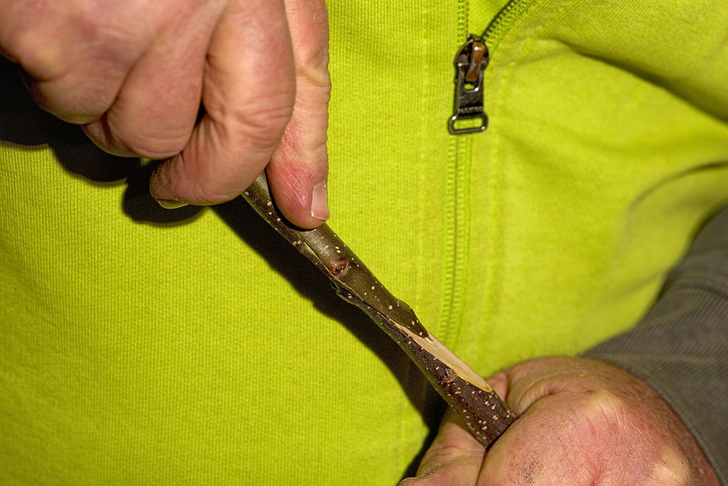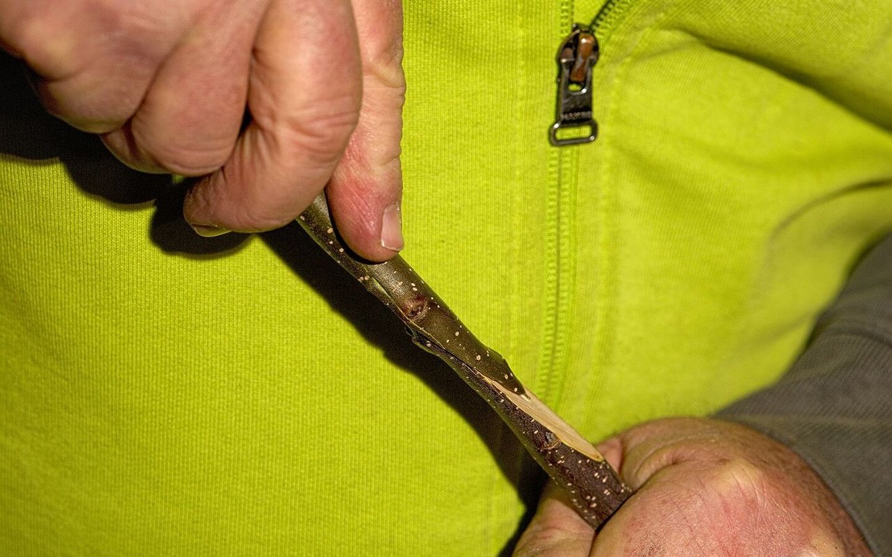 Als Nächstes ist das Edelreis dran. Dieses muss etwa gleich dick sein wie der Trieb. Glauser kürzt es auf drei Augen ein.