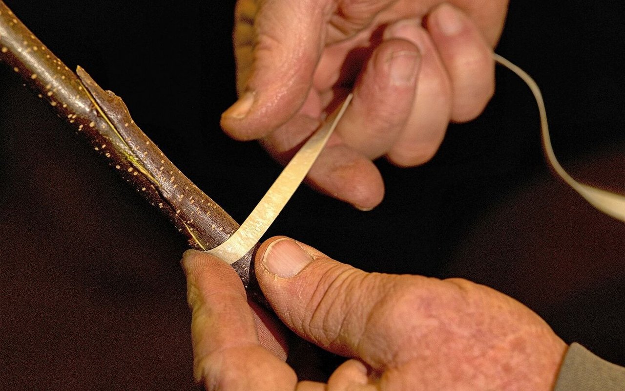 Sorgfältig fügt Glauser die Zungen von Edelreis und Unterlage zusammen. Die Gegenzungen vergrössern die Flächen und geben Halt.