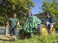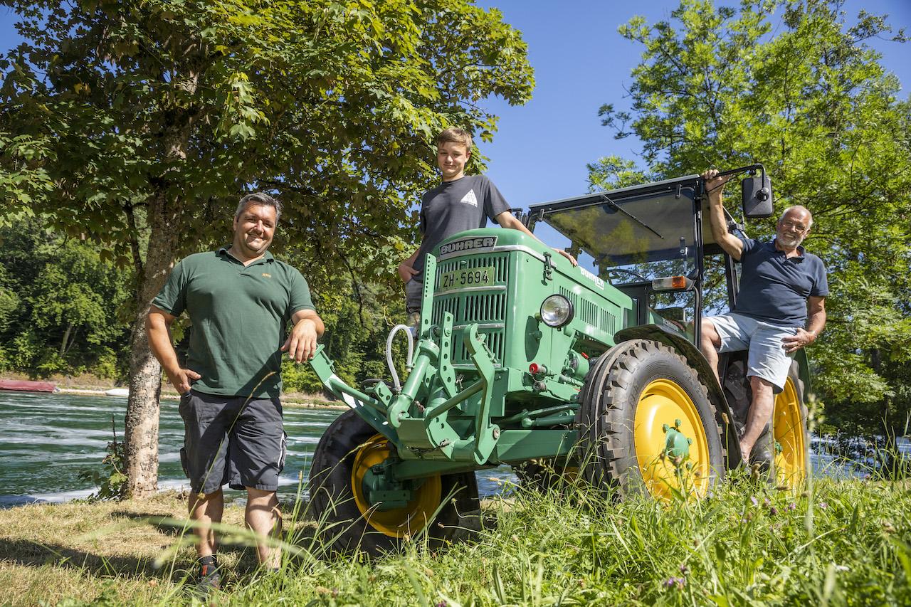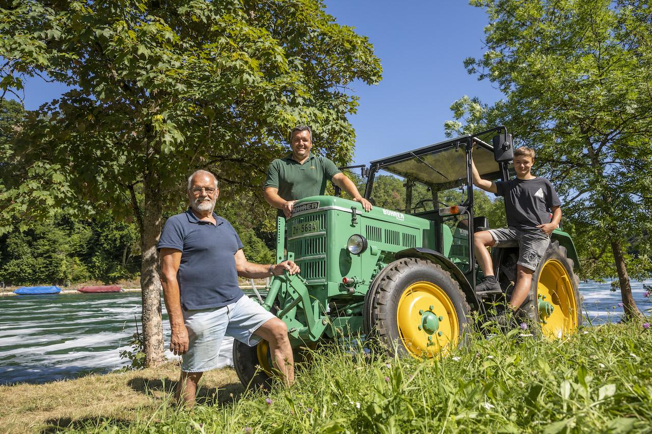 Der Bührer PF 21 begleitet Walter Studer (links) schon sein Leben lang und ist ihm ans Herz gewachsen. Mittlerweile gehört der Traktor seinem Sohn Sven (Mitte). Auch Enkel Sandro (rechts) hat Freude daran. Der Traktor wurde immer wieder angepasst, mit einer Sturzkabine, einem Hubkraftverstärker, einem hydraulischen Bremsventil, einer Fronthydraulik und einer hydrostatischen Lenkhilfe. Auch wurde die Spur auf 1,50 m erweitert.