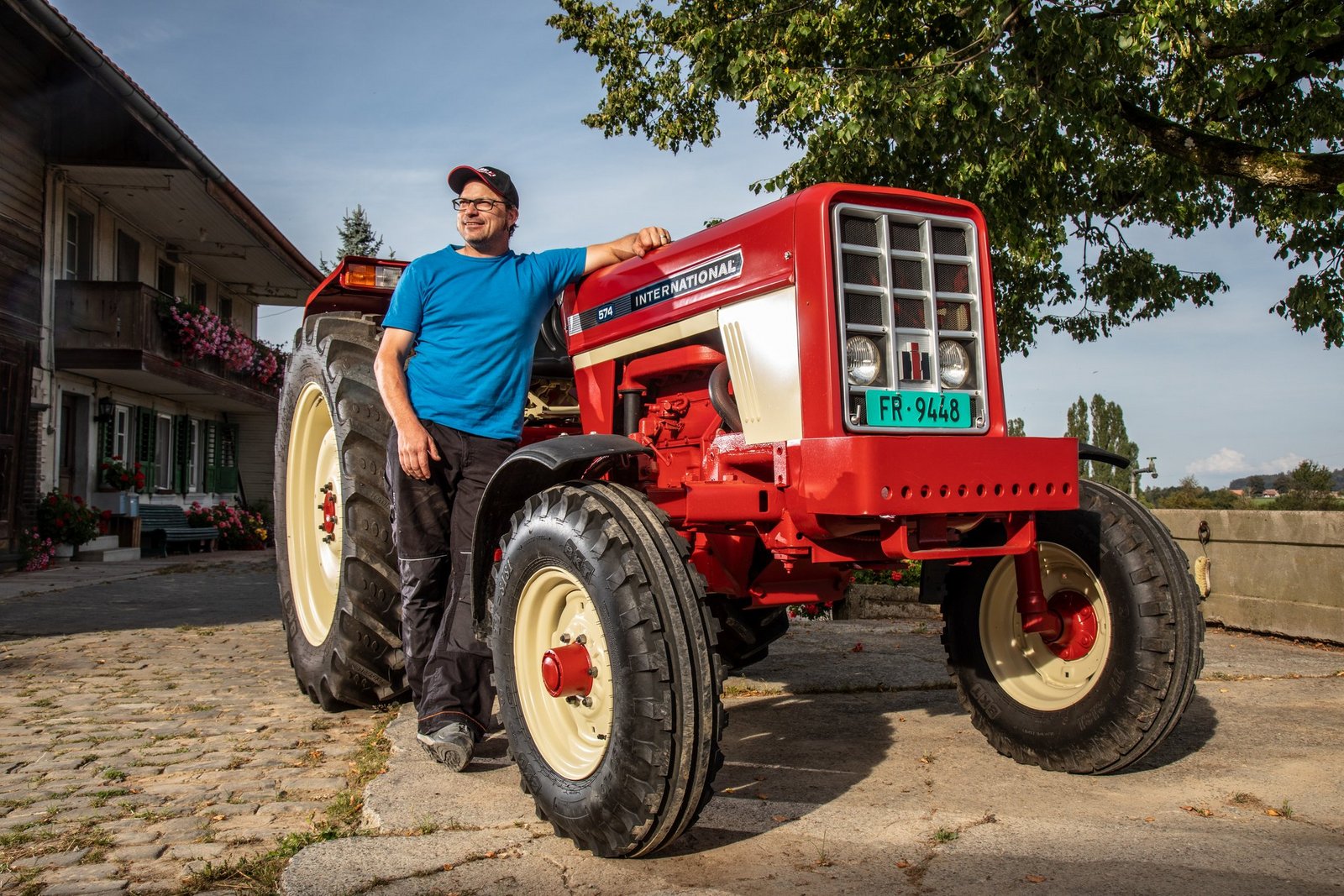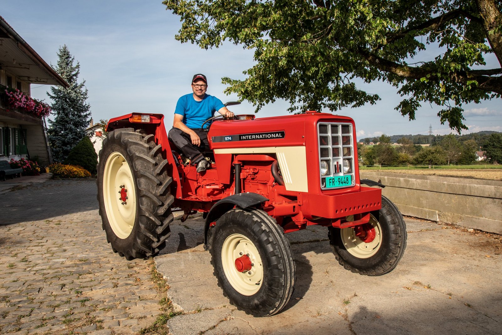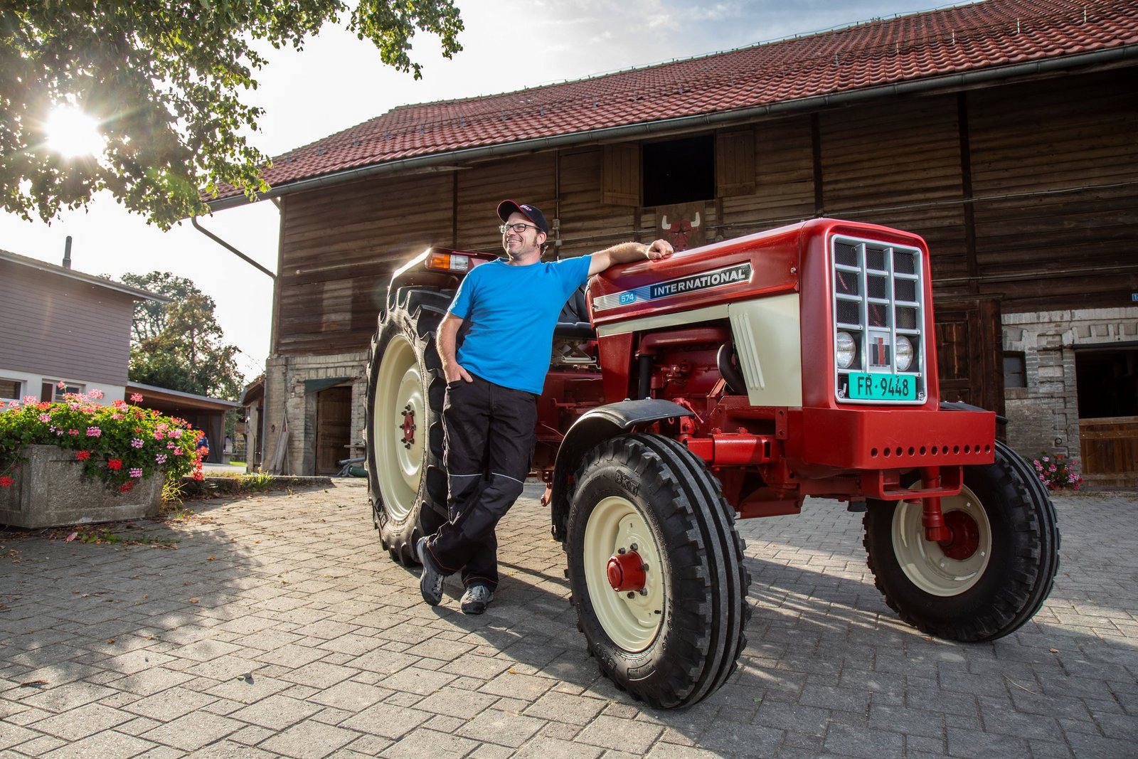 Elmar Hayoz (41) ist Landwirt in Jetschwil in Düdingen FR: «Mein Vater hat diesen International Harvester IH 574 im Jahr 1972 gekauft. Dieses englische Modell konnte man als ersten Traktor mit einem hydrostatischen Antrieb haben.»