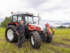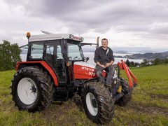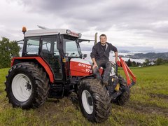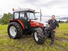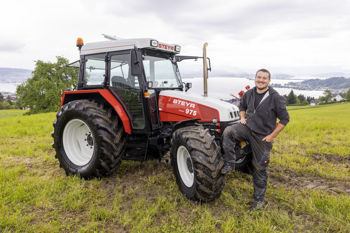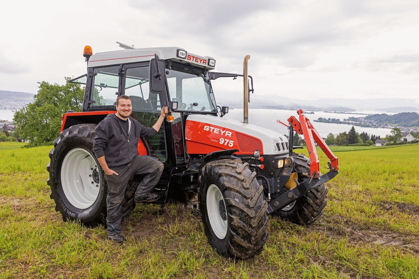 Der Steyr 975 ist ein idealer Mähtraktor durch die achsgeführte Fronthydraulik und der integrierter Entlastung. Eingesetzt wird der Traktor hauptsächlich am Mähwerk und beim Transport eines Vier-Tonnen-Baggers.»