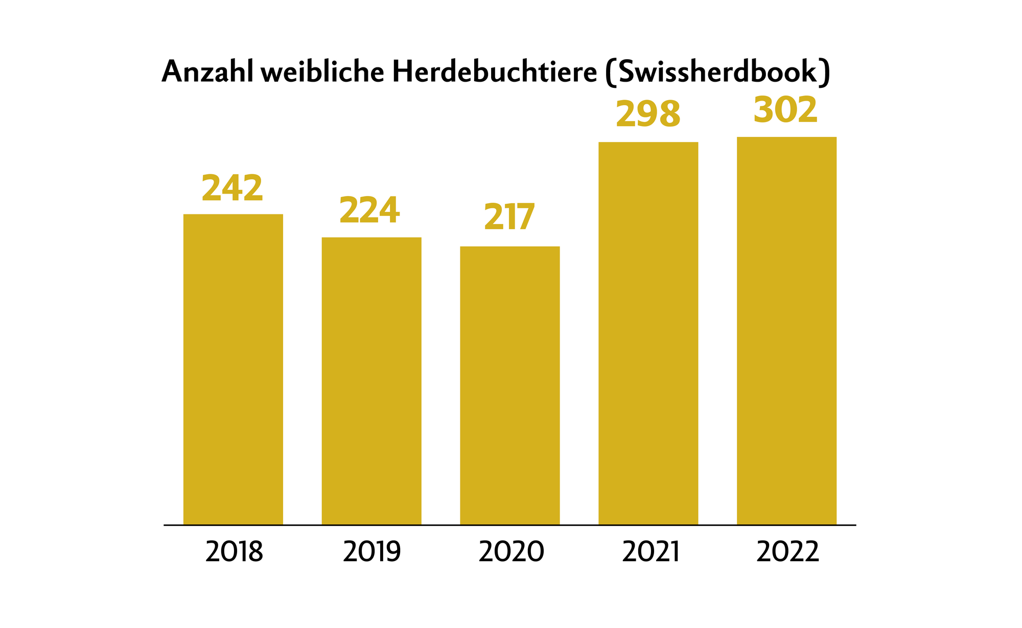 Bei der Original Evolèner Viehzuchtgenossenschaft sowie dem Evolèner Zuchtverein wurden 2022 insgesamt 302 weibliche Herdebuchtiere gehalten. Das seit Kurzem vereinheitlichte Herdebuch führt Swissherdbook.