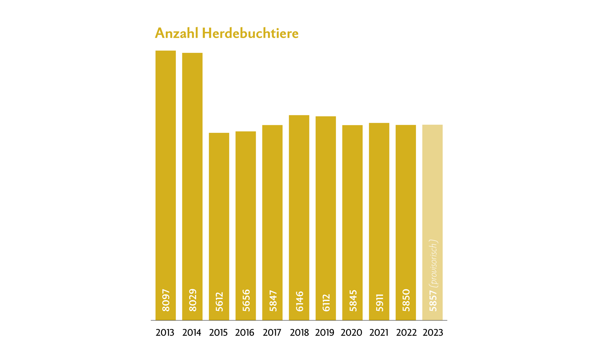 Der Knick zwischen 2014 und 2015 kommt durch eine administrative Bereinigung der Herdebuchzahlen zustande und ist kein eigentlicher Einbruch. Ebenfalls technischen Ursprungs ist die Abnahme von 2020: Seit diesem Jahr werden Schafe und Ziegen in der Tierverkehrsdatenbank registriert.