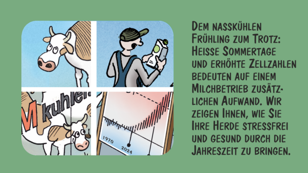 Dem nasskühlen Frühling zum Trotz: Heisse Sommertage und erhöhte Zellzahlen bedeuten auf einem Milchviehbetrieb zusätzlichen Aufwand. Marco Ratschiller/Karma hat Vorschläge, wie LandwirtInnen die Herde stressfrei und gesund durch den Sommer bringen.
