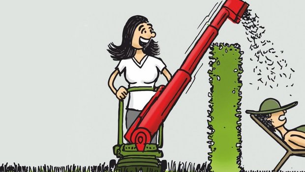 Cartoon von Marco Ratschiller/Karma: Den Mähdrescher auf die Ernte vorbereiten