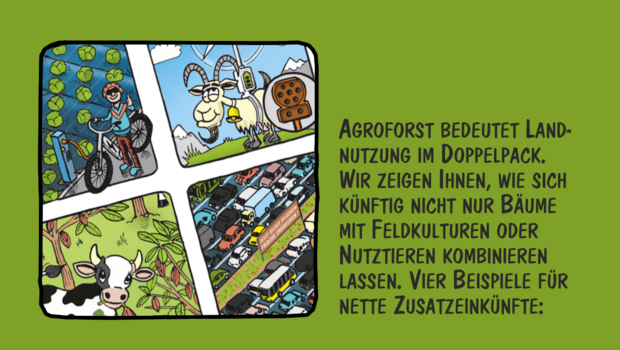 Cartoon von Marco Ratschiller/Karma: Landwirtschaft im Doppelpack dank Agroforst